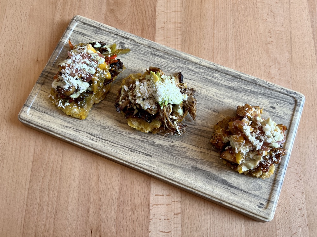 A similar approach can work with the tostones. These crisp slabs of fried plantain are topped with a choice of chicken paired with mango, a vegetarian option with mushrooms, and more of the same pernil found in the empanadas. These types of fillings and toppings also appear in formats adapted from Mexican traditions, resulting in trios of tacos. The standout choice here is the carne picante, a spicy steak filling, but pork, chicken, and meatless options are also available. The elote, another Mexican influence, is a suitable side with any of the taco meals.