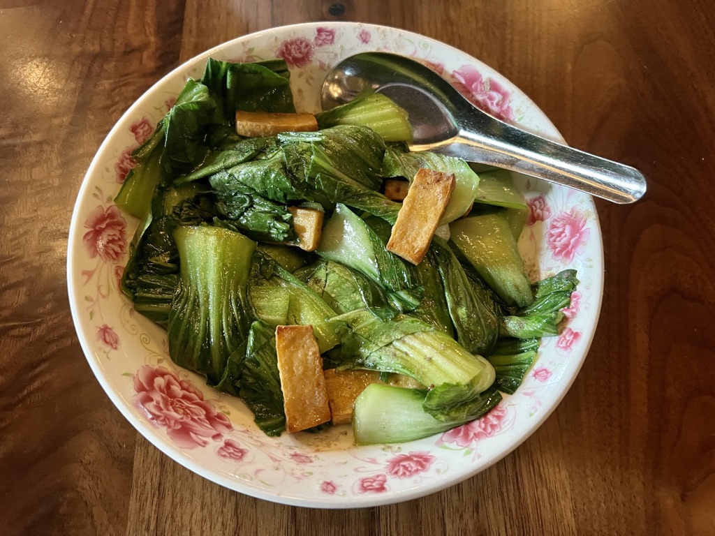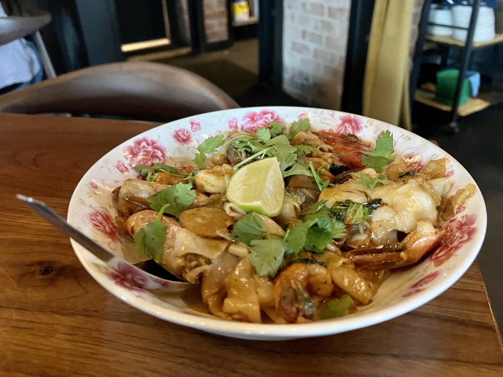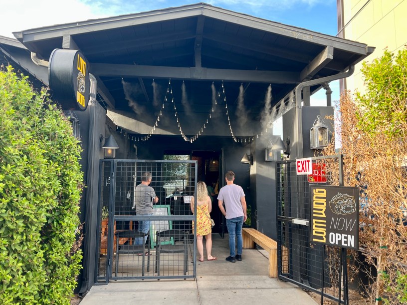 Lom Wong has evolved from a pandemic-era pop-up to a full service restaurant in an historic bungalow on Portland Street. The house has been home to several places that have lasted only a year or two, but Lom Wong seems likely to stay around longer. The location is three blocks from Roosevelt/Central station on the B Line, and bike racks are found around the corner on Second Street. The restaurant’s entrance is marked by an outdoor host station that leads to both a shaded patio and a dining room with dark wood tables and lights decorated with orchids.