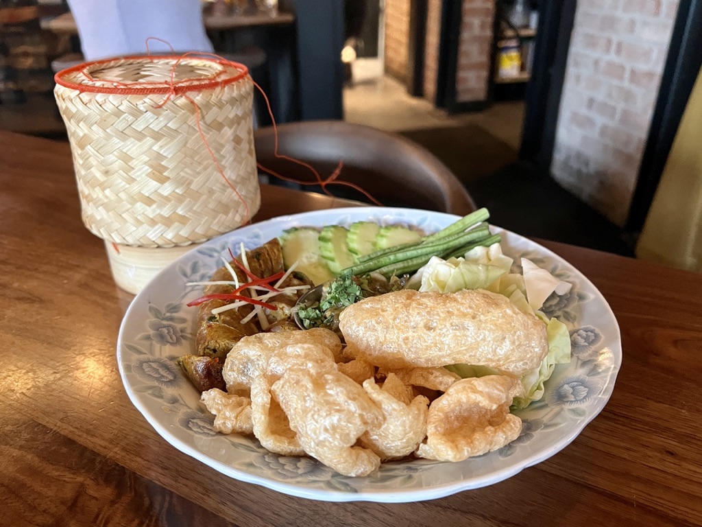 Another relatively straightforward item is a small stir-fry of tofu and bok choy with garlic and chili. Too small to be an entree on its own, it functions well as a vegetable side dish. The rest of the menu moves in a direction of more complex dishes that reflect the nuance and balance of flavors intrinsic to Thai food. Charcoal-grilled northern Thai sausage, sai ua, is served with nam prik noom, a dip made with roasted green chilies, shallots, and cilantro. Pork rinds are provided for dipping, and sticky rice is served in a basket lined with plastic wrap to retain moisture.