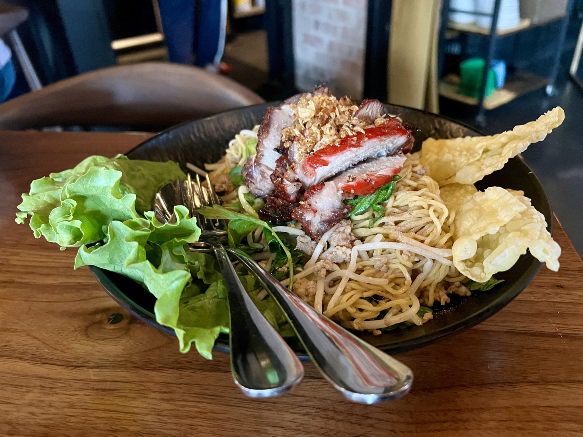 As with any Thai restaurant, there are noodle dishes on the menu, although like the curries and stir-frys, they reflect specific regional recipes rather than the more commonly encountered pad Thai or pad see ew dishes. Bamee haeng mu dang are springy egg noodles with pork two ways – char siu with a crisp crust and ground pork – served with plenty of bean sprouts, fried wontons, some bok choy, and a bed of lettuce. Tom yum haeng sen yai involves wide noodles tossed with tomatoes, straw mushrooms, and langoustines, large crustaceans served whole.