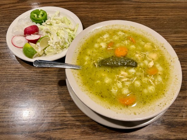 Although Poncho’s never really ventures into spicy territory, a white chicken pozole served only on weekends is a bit bolder than most of the menu and worth exploring. There’s a roasted jalapeño at the center of the bowl with slices of the same among the radishes and cabbage served on the side. It’s a good choice to enjoy in the Cantina, which has the same menu but its own back entrance. There is no drink menu per se, but the bartender can create drinks like a mango margarita with a Tajin rim, chamoy, and a tamarind stick or pour a pint of draft beer.