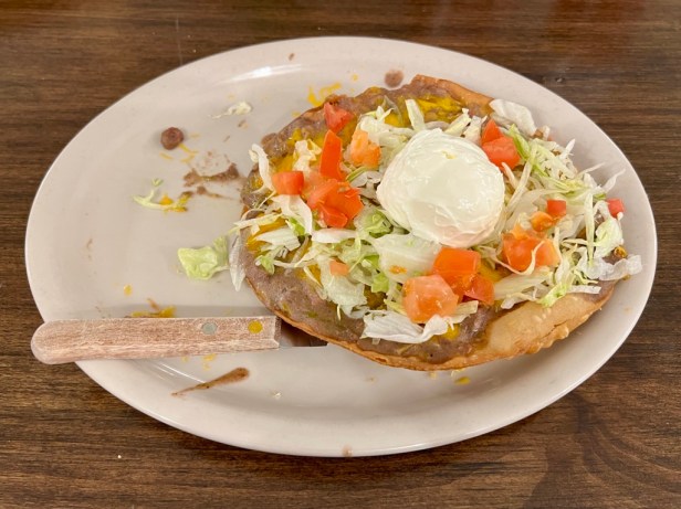 A more consistent section of the menu is labeled “Favoritas de la Casa,” and it’s a collection of Mexican-American specialties that have endured at Poncho’s during its many decades of operation. The Crudo Burro is a hearty burrito filled with machaca and green tomatillo salsa and topped with red enchilada sauce and melted cheese. The tostada verde is a crisp tortilla layered green chili beef, cheddar, lettuce, sour cream, and tomatoes. Pollo fundido is a variant of a chimichanga with a fried burrito full of chicken meat topped with a cream cheese sauce.