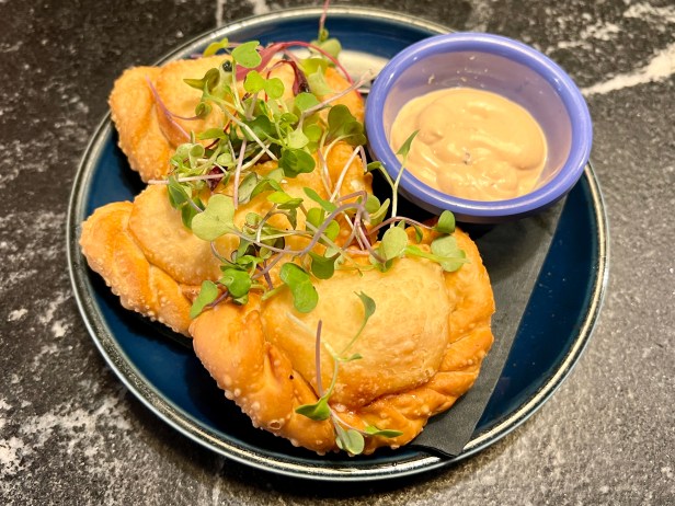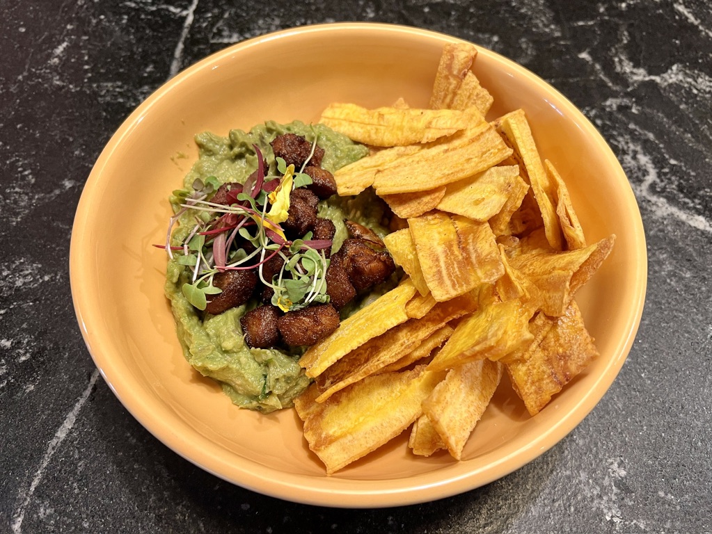 The on-again, off-again lunch menu also has a salad with a bright assortment of cucumber, tomato, lettuce, and onions. The mojo verde sauce served on the side with many dishes makes a perfect dressing.for this bowl of greens. There is no dessert per se, but the guava and cheese empanadas, a classic combination of flavors within a pastry shell might work in this role. They’re quite filling and definitely something that will work for an entire table. Surprisingly, these sweet, creamy treats are paired with a chipotle sauce that seems out of place in this context.