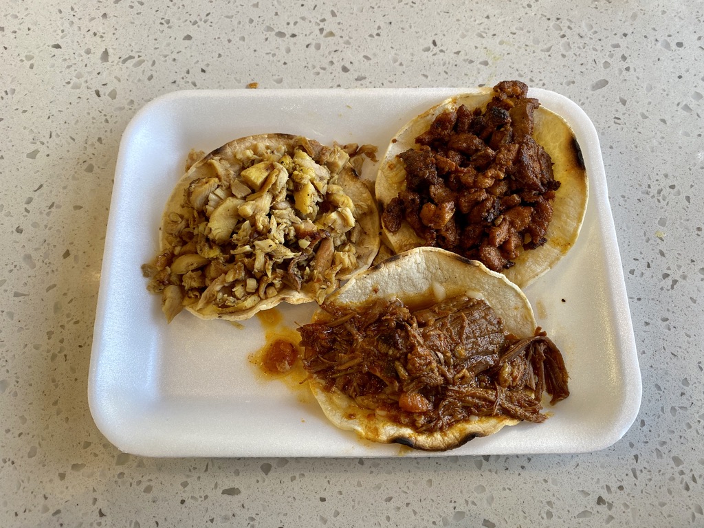 The result is a filling of minced, charred beef, seasoned only with a bit of salt and lime, placed on top of or within tortillas and ready for accessorization at the salad/salsa bar found in each of the restaurants. Among the other beef offerings, the barbacoa is equally delicious, albeit completely different. More tender and yielding than the carne asada, its supple character makes it well-suited to blending with cheese in a quesadilla. The cabeza is even more tender with a fattiness verging on short rib. Tripa is of course completely different with its chewy texture.