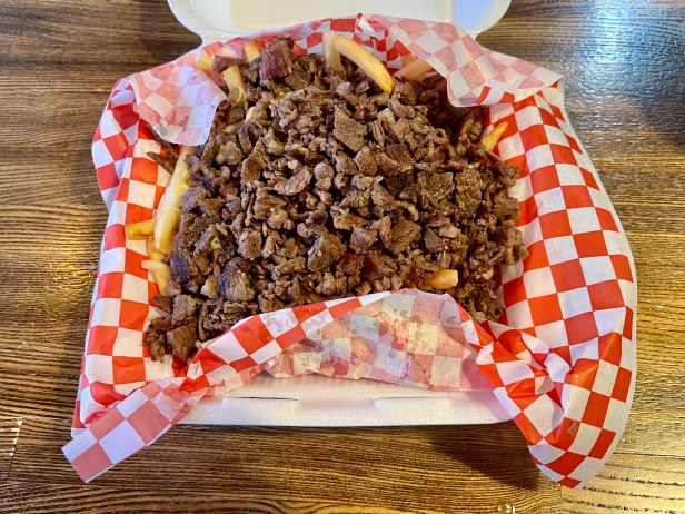 The two non-beef offerings are pollo asado and pork al pastor, both serviceable choices but unlikely to displace the beef selections as the menu favorites. All the meats can be made into tacos, burritos, quesadillas, or vampiros (a variant of the tostada in which the tortilla is crisped to order on a griddle). A do-it-yourself option is the plato, a generous platter of meat with creamy refried beans and a multitude of tortillas. For something with a completely different format, the carne asada fries are just three layers: potatoes, cheese, and meat waiting to be accessorized.