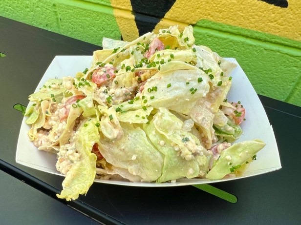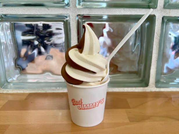 Chicken wings seasoned with a dry rub also make frequent appearances, and gussied-up sandwiches of turkey or mortadella have also been featured. For sides, there are two main choices: crisp waffle fries seasoned only with a little salt and packets of ketchup or a slab salad, a variant of the popular iceberg wedge salad with bacon, chives, grape tomatoes, and Thousand Island dressing. The everyday dessert at Bad Jimmy’s is soft serve, offered in classic vanilla and chocolate flavors, as well as the option of a swirled combination of the two.