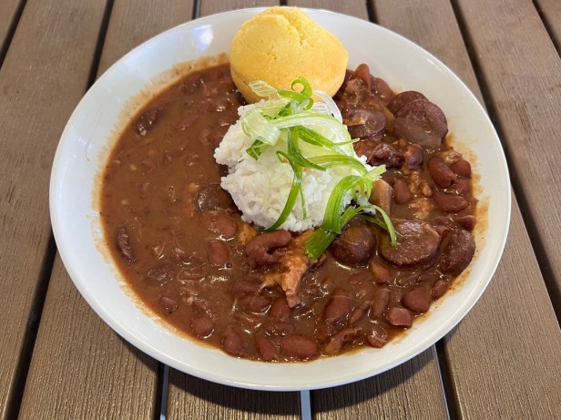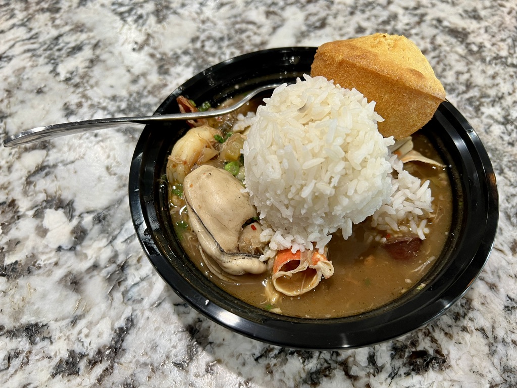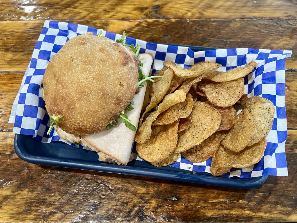 The final Lousiana touch here is a big bowl of red beans and rice with smoked turkey, abundant beans, and sausage over fluffy rice and a little shaved onion on top for good measure. It has a slight burn and appreciable depth of flavor. Like the etouffee and the jambalaya, it comes with a slightly sweet corn muffin. Beyond its “bayou bowls,” the phrase used on the menu, CC’s offers several sandwiches, including smoked turkey on a toasted focaccia roll with a bit of unexpected spiciness from harissa verde mayo, smoked cheddar sauce, olive tapenade, and arugula.