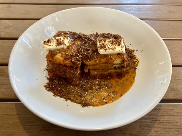 CC’s menu includes all-day breakfast fare and plenty of options for hearty lunch. Morning favorites include fluffy buttermilk pancakes, breakfast sandwiches and burritos, and praline French toast. The last item stands out in particular. It is made with milk bread, finely ground pecans, and an assertive seasoning mix that recalls Chinese five spice. The fennel present in the finished product offers an effective balance to the sweet notes found elsewhere. Meaty sides include bacon, in addition to chicken sausage patties with a bit of tang from powdered vinegar.