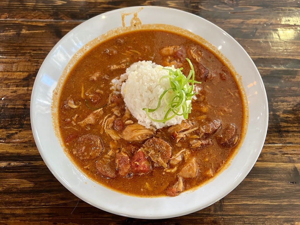 Shrimp also star in an etouffee, and again with this dish, CC’s isn’t afraid to depart ever so slightly from tradition while losing none of the dish’s classic essence. In this case, the crustaceans swim in a thick sauce with a pleasingly coarse holy trinity that involves gold bell peppers in place of the usual green. Shrimp is an optional add-on to the sausage and chicken already included in the jambalaya, made with a thick, deeply flavored roux. Hot sauce can be requested, but it might not be needed because this is already one spicy bowl of jambalaya.