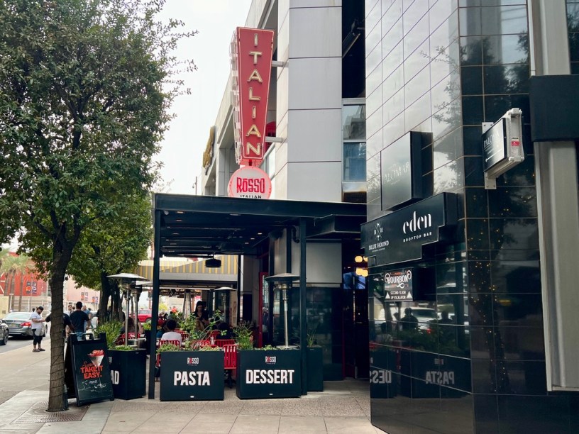 Rosso has a busy, well-shaded patio facing First Street, and an indoor-outdoor bar offering three sides of counter seating. Beyond the host station lies a dining room where walls of brick and bare concrete are punctuated by images of Sophia Loren and other icons of Italy. High ceilings with exposed ducts and pipes overhead add to a quasi-industrial feel that contrasts with the more urbane aesthetics of the stylishly plated and presented food. Red is naturally the predominant accent color as seen in the bar stools and chairs throughout the restaurant.