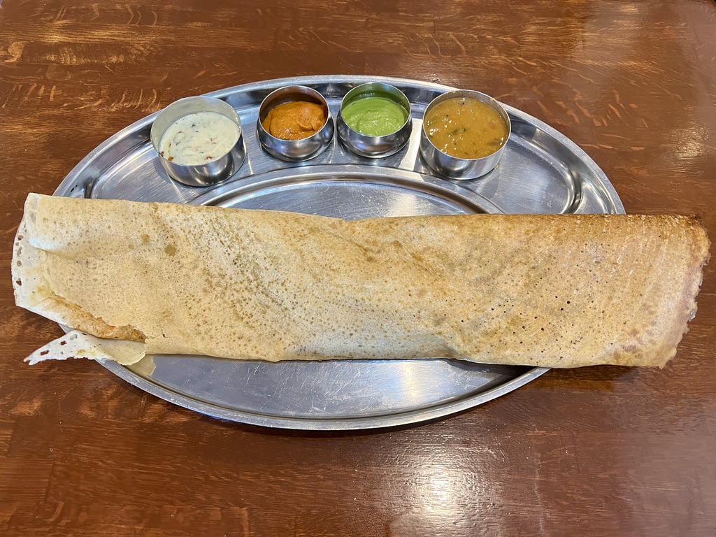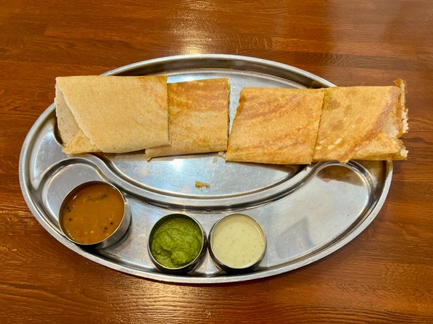 Beyond the familiar masala dosa, Vayal’s offers several other variations. These include a simple dosa cooked on a griddle with a thin layer of egg on top and more complex choices like mysore dosa, in which the crepe is coated in a red chutney coating before being cooked and stuffed with masala curry, and the spring dosa, which is augmented with sauteed cabbage, carrots, onions, and peppers in addition to the usual potato curry. It seems like an Indo-Chinese variation on a traditional South Indian food, and it works well as a blend of multiple influences.