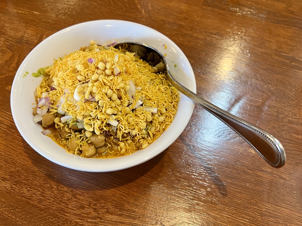 All portions of the menu are divided into vegetarian and non-vegetarian sections with nearly equal weight given to each. Samosas and pakoras are familiar fried favorites found at the beginning of the menu. The spice level goes up a notch with aloo tikki chole, patties similar to potato pancakes served with a chickpea curry and topped with crisp bits of sev (fried gram flour vermicelli), minced onions, and a bit of yogurt. Indo-Chinese cooking is represented with gobi Manchurian, fried cauliflower, while chicken 65 is crisp bits of poultry in a south Indian spice mix.