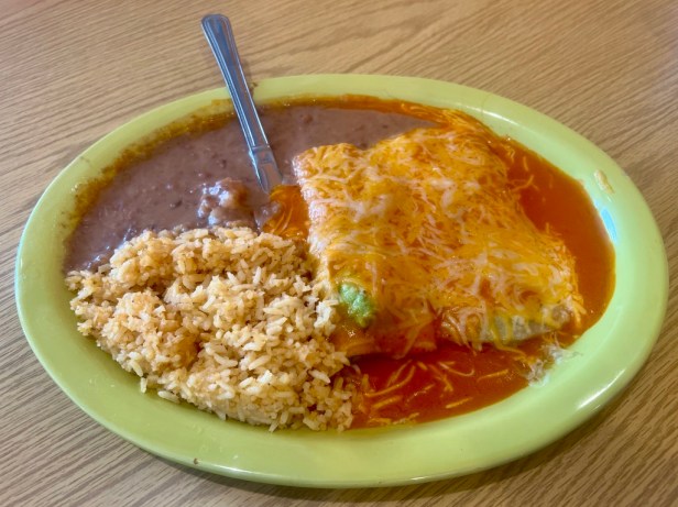 A printed, laminated menu outlines the restaurant’s standard array of Mexican favorites, along with recurring specials on specific days of the week. A white board near the back touts additional specials such as a meatless calabacitas platter offered during Lent. The menu begins, as at so many local Mexican restaurants, with numbered combination plates offering crispy tacos or supple enchiladas filled with different proteins and presented in various configurations with sides of rice and beans. These are available throughout the day for lunch or early dinner.