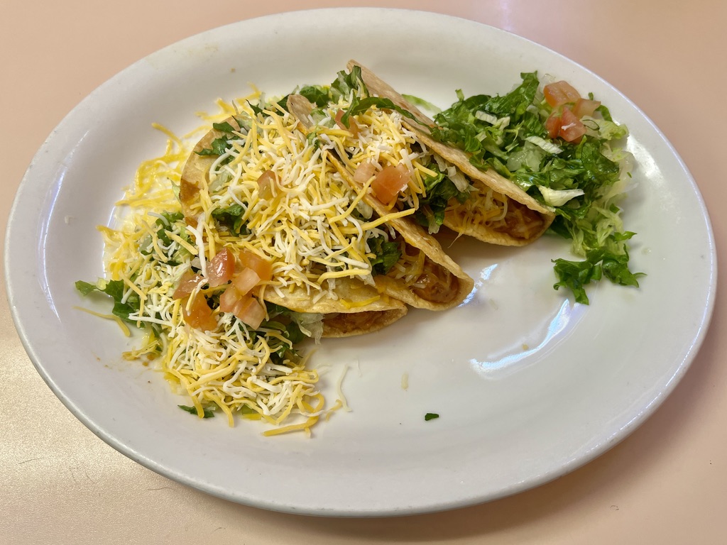 The default taco fillings are shredded beef or chicken garnished with lettuce. cheese, and tomato, but the Cha Cha tacos are distinctive with creamy beans punctuated by pockets of spice from chorizo. Equally interesting are enchiladas stuffed with cool guacamole inside warm tortillas topped with red sauce and melted cheese. Back to meat, carne asada with a slight, smoky char is prominent on the menu, as is the machaca, shredded beef seasoned with slight heat and deep taste from chilies, tomato, and onions with the option to add scrambled eggs.