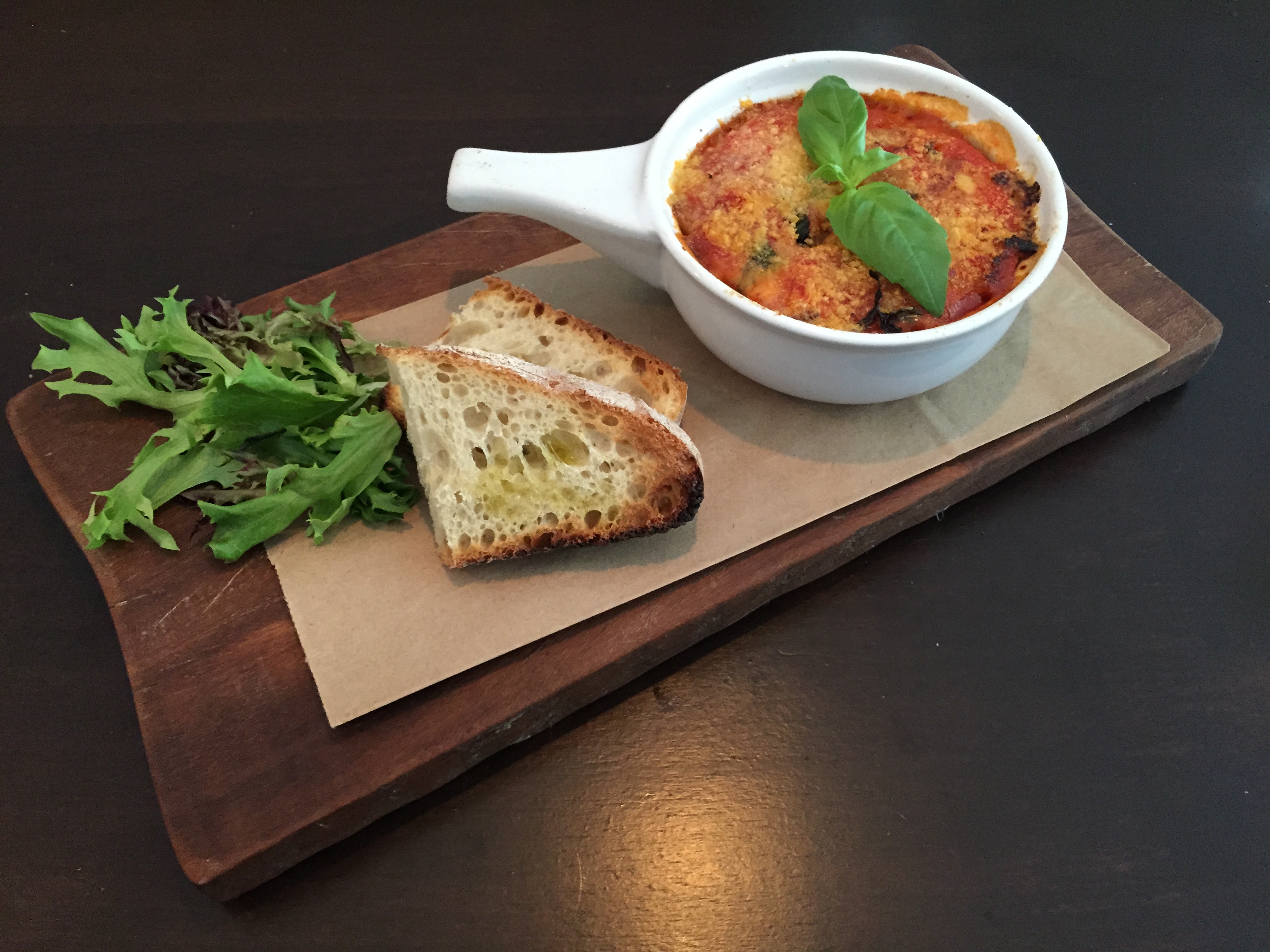Among the appetizers are two varieties of bruschetta, one with creamy burrata, grape tomatoes, and basil, and another with prosciutto, gorgonzola, and figs. An antipasto plate features cured meats, cheese, and vegetables. Eggplant parmigiana, meatballs with spicy marinara, and roasted cauliflower with both bechamel and Bolognese sauces are all starters that repeat the kitchen’s theme of wood-fired food. Standout salads include Ciopatta with fennel, endive, tomatoes, and hearts of palm over greens and Rucola with arugula leaves, pears, and almonds.
