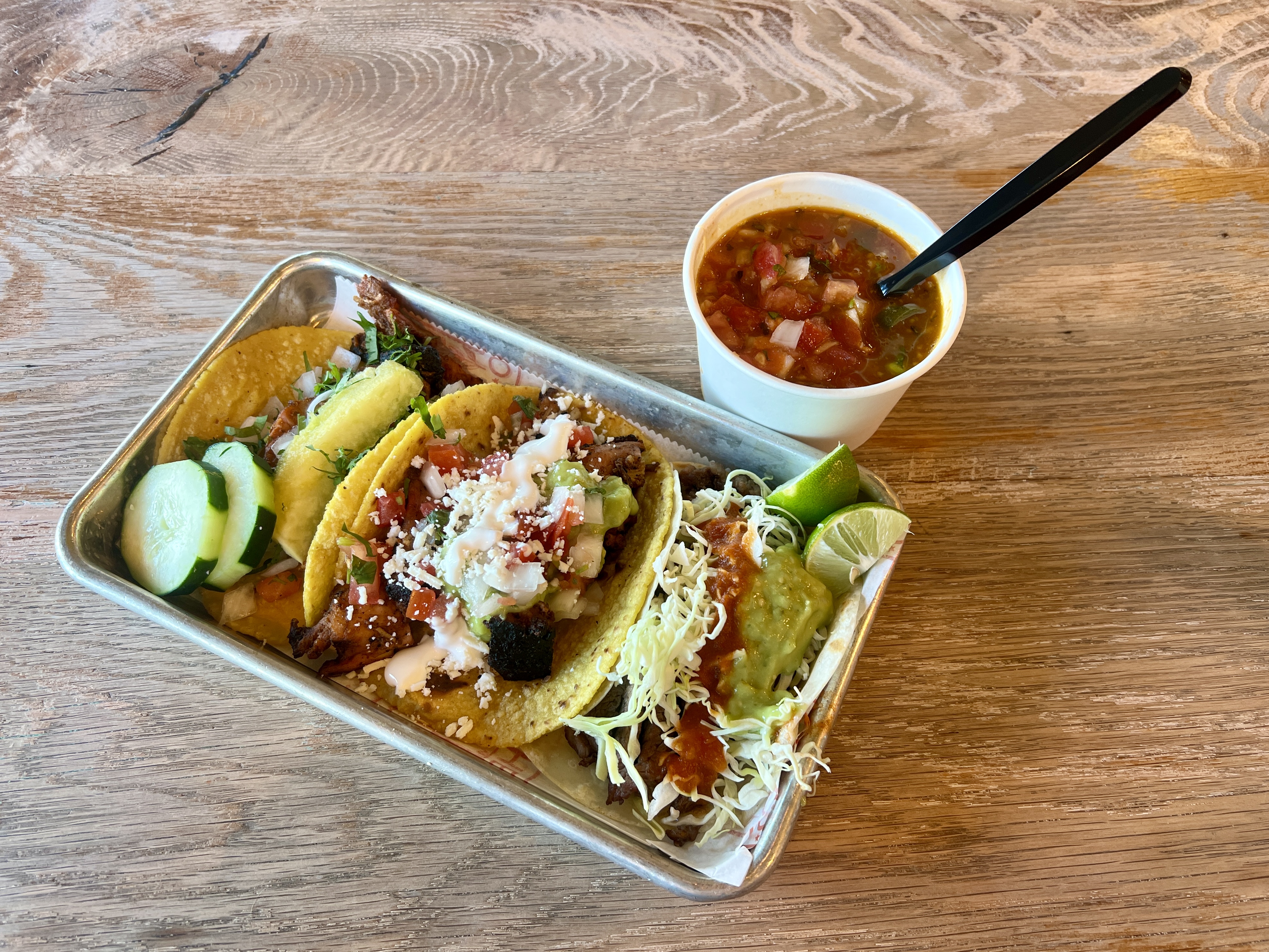 The fish tacos feature beer battered fried seafood paired with cabbage, crema, pickled onions, and pico de gallo. The vegetable taco draws substance from roasted sweet potato, which is mixed with feta, romesco sauce, and pepitas. It’s one of the more complex and rewarding meatless tacos around. A few tacos should make a meal for most customers, but another option is to add a side of either creamy refried beans or frijoles a la charra, pinto beans stewed whole with a bit of bacon, pico de gallo, and seasonings. The result is a somewhat smoky bean soup.