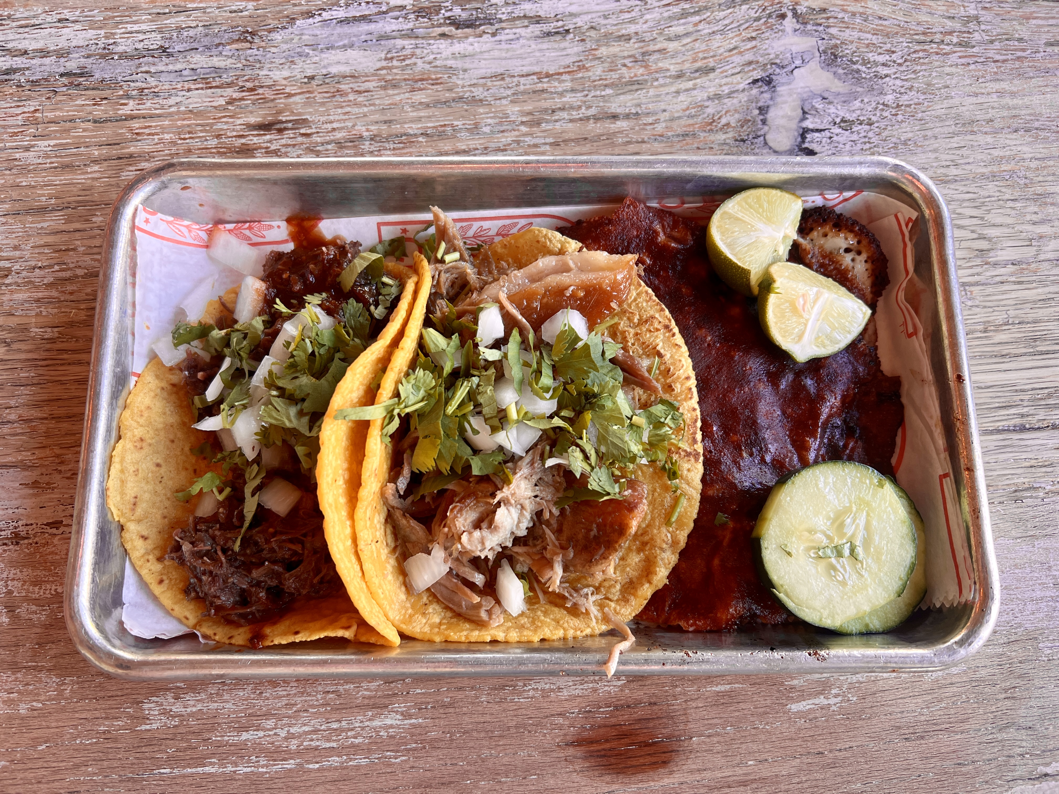 Despite some distinctiveness in each location’s decor, the compact menu is identical in both cities. There are two starters suitable for sharing. A basket of chips is presented with two salsas, one medium in heat and red in color and the other a fiery green, as well as guacamole. Chicharrones, essentially fried pork rinds dusted with cotija cheese and ground chilis, are paired with the same dips. Other items under the heading of “botanas” function less as appetizers and more as entrees in their own right. That includes small quesadillas and several other favorites.
