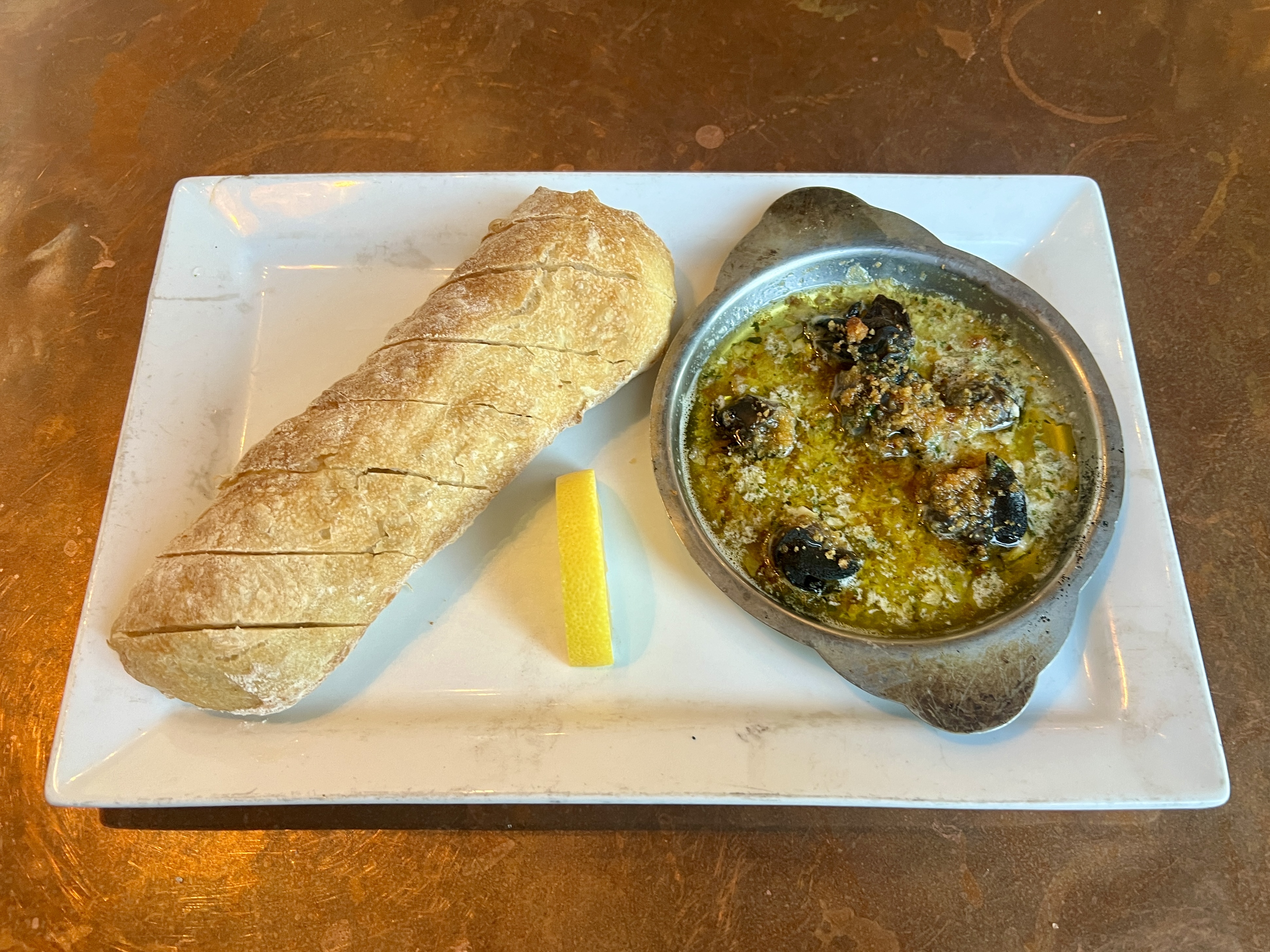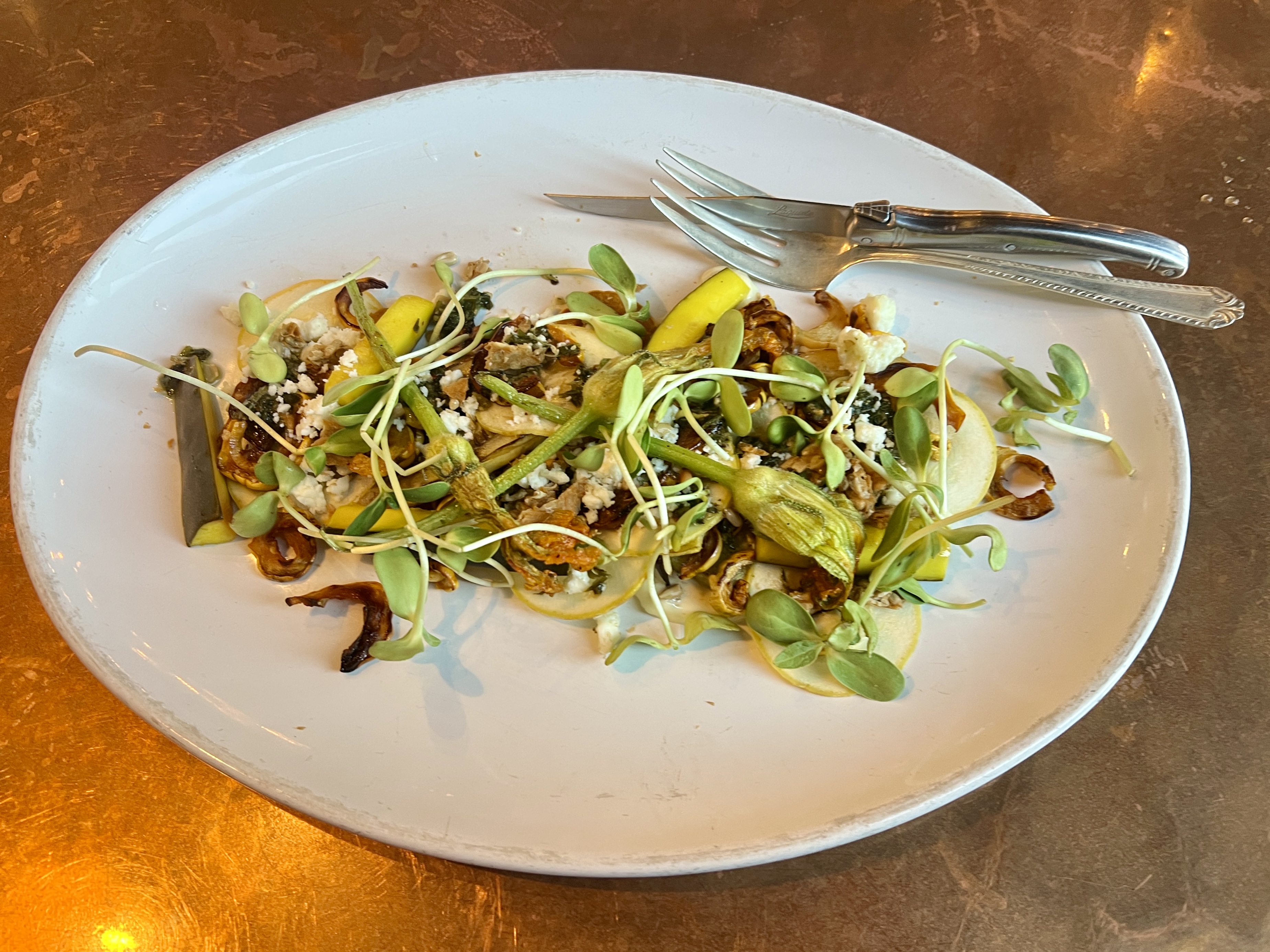 Smaller plates can include classics like escargot, presented out of the shell with the classic accompaniments of garlic butter and crusty baguette, or seasonal innovations like a summer squash dish, which exemplifies the kitchen’s approach of using related ingredients in different ways. On the generous platter, the squash blossoms are not fried, so they actually retain their own taste and texture. At the same time, striped delicata is sliced lengthwise and grilled, zucchini is cut into sticks, and Mexican gray squash is seared and seasoned with a bit of feta.