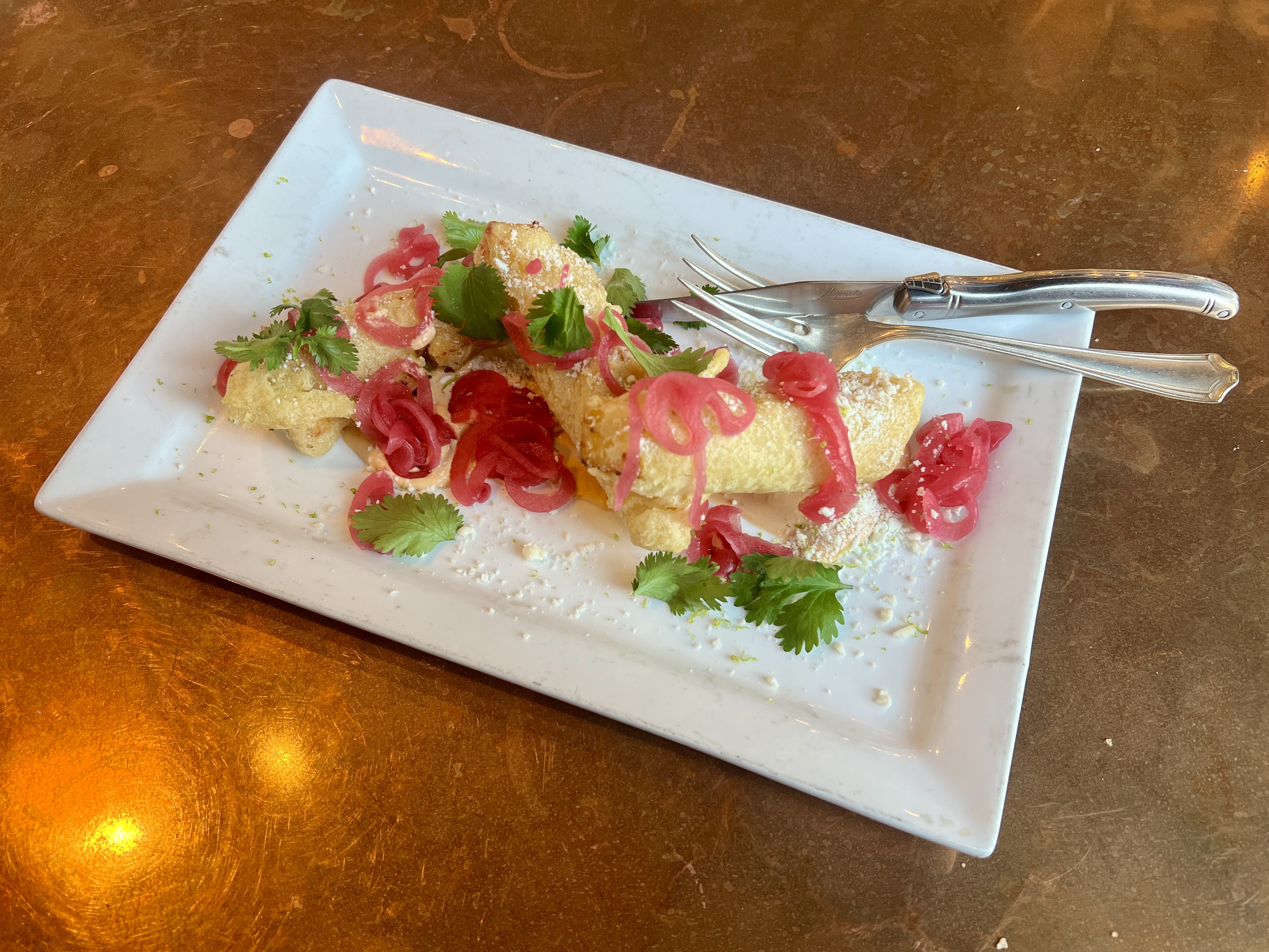 Dishes that approach more traditional entree territory generally include one or two pasta dishes at any time. A lamb birria raviolo is essentially a giant pocket of pasta stuffed with tender braised meat and surrounded by a pool of consomme and accessorized with kernels of corn, pickled onions, bits of squash, tortilla strips, and goat cheese. Other recent pasta items have included linguine with grilled shrimp and a meatless dish of hand cut noodles with roasted tomatoes. Arborio rice instead of pasta is the carbohydrate base for a paella with scallops and chorizo.