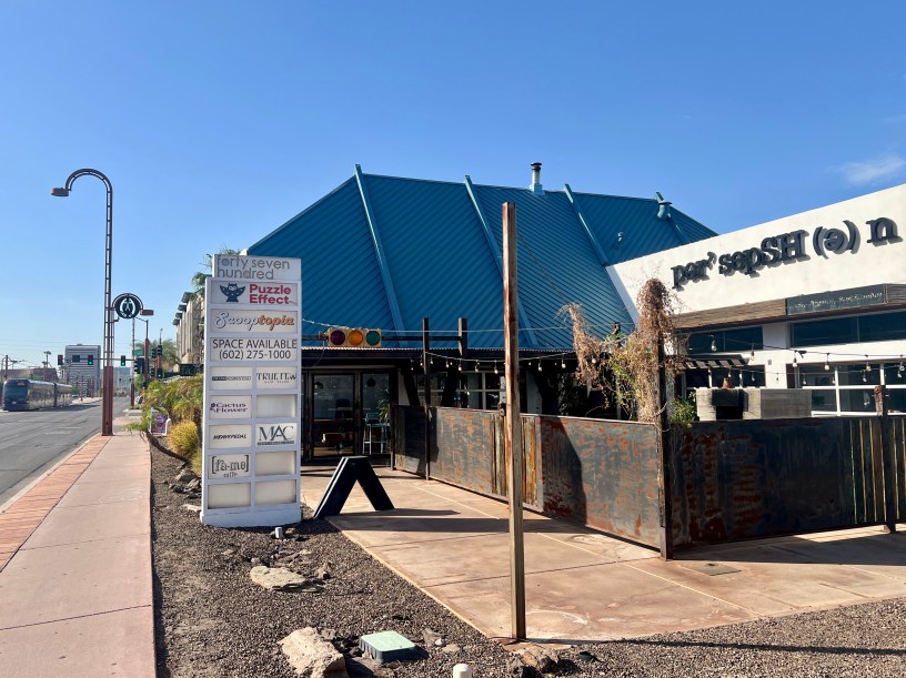 Persephen, a play on the word “perception” indicated by a dictionary-style pronunciation guide on the sign identifying the restaurant, is found on Central Avenue halfway between the light rail stations at Central and Campbell on the B Line. Central/Camelback offers a slightly shorter walk to and from the train, and bike racks are found behind the restaurant’s entrance, near the patio and the parking lot. The restaurant occupies a distinctive standalone building that combines an A-frame structure with a large hexagonal window that allows abundant natural light into the dining room.