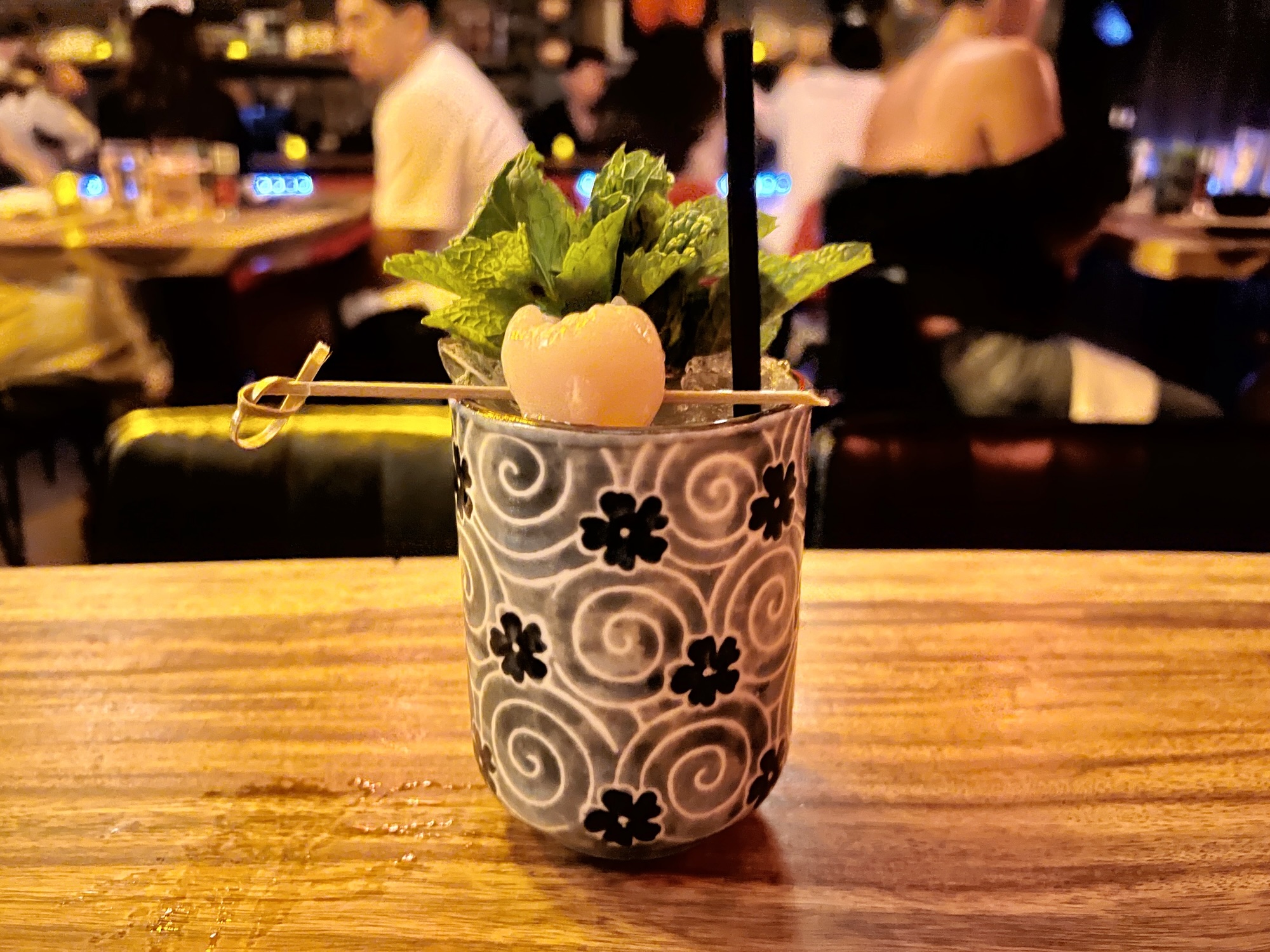 The restaurant has a punk rock aesthetic with a Tokyo twist. The walls are covered with vintage posters, photos, and flyers bearing the likenesses of not only Anglo-American legends like Sid Vicious, but also Japanese bands like The Stalin. The rooms are generally dark, but lanterns with Japanese characters on them enhance both the lighting and the decor. The color inside is as red as a mission to Mars, adding to the restaurant’s nocturnal feel. The wall furthest towards the back of the restaurant breaks the pattern with a colorful mural of swords and dragons.