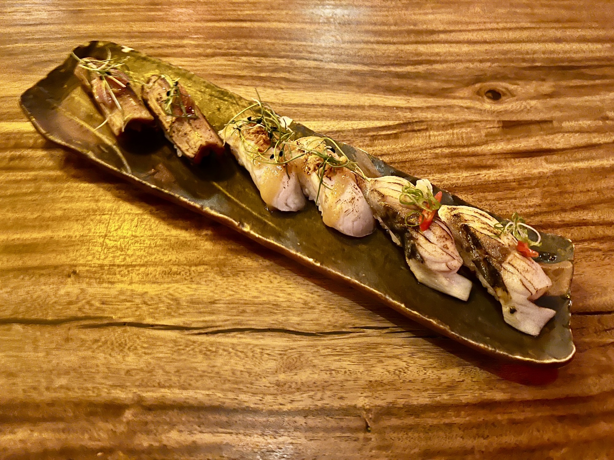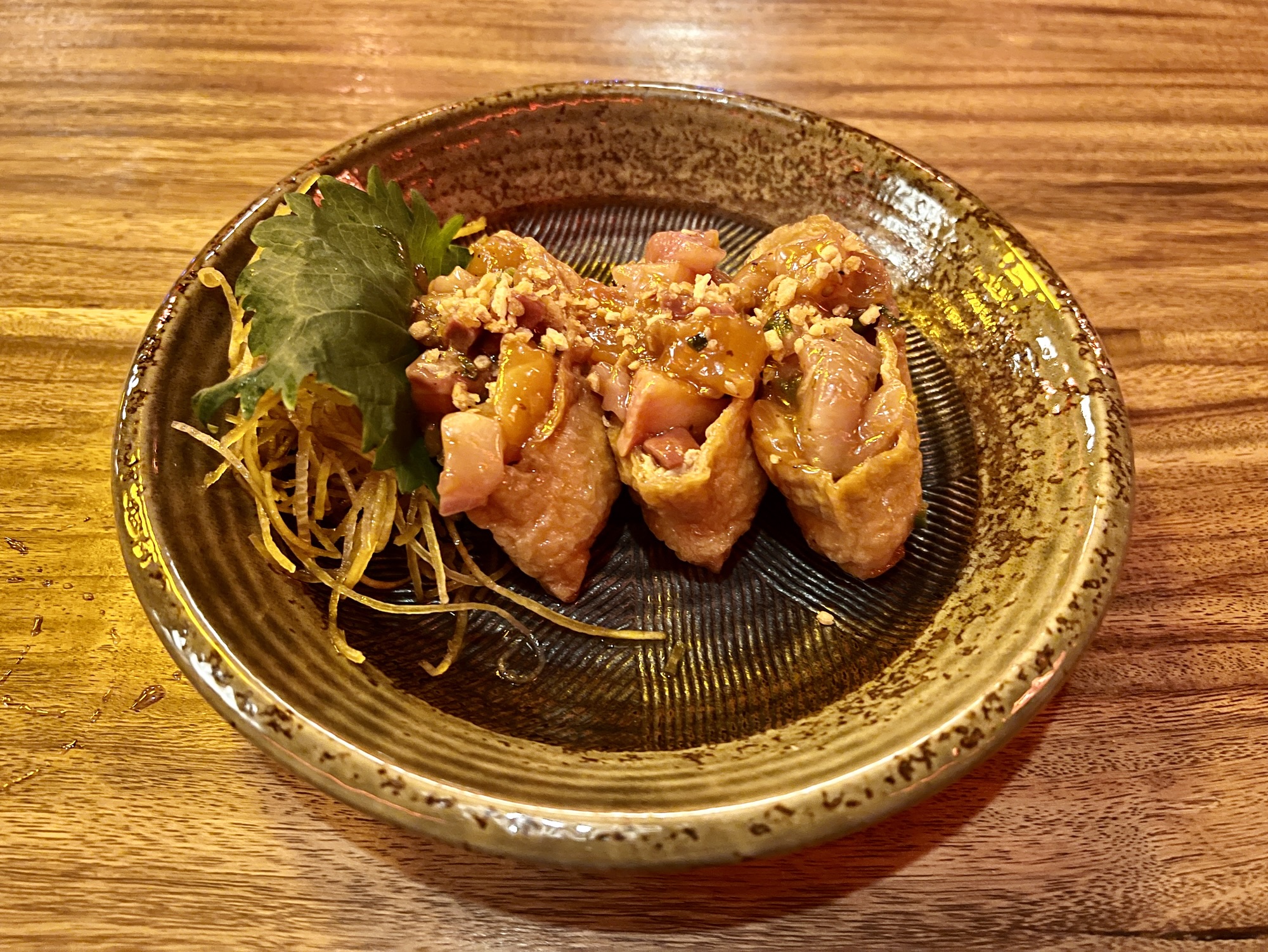 Other ubiquitous Japanese restaurant starters receive their own distinctive touches here: Edamame are served with a coating of roasted chilies and garlic; the seaweed salad is dusted with fried shallots; and the gyoza, although stuffed with ground pork, are fried in tallow from wagyu beef. Although not officially classified as an appetizer, the poke inarizushi fit well in this role. Three pockets of tofu skin are stuffed with a mixture of sweet rice and diced fish. The slightly tart marinade and a topping of garlic crumble contrast with the sweetness of the grain.