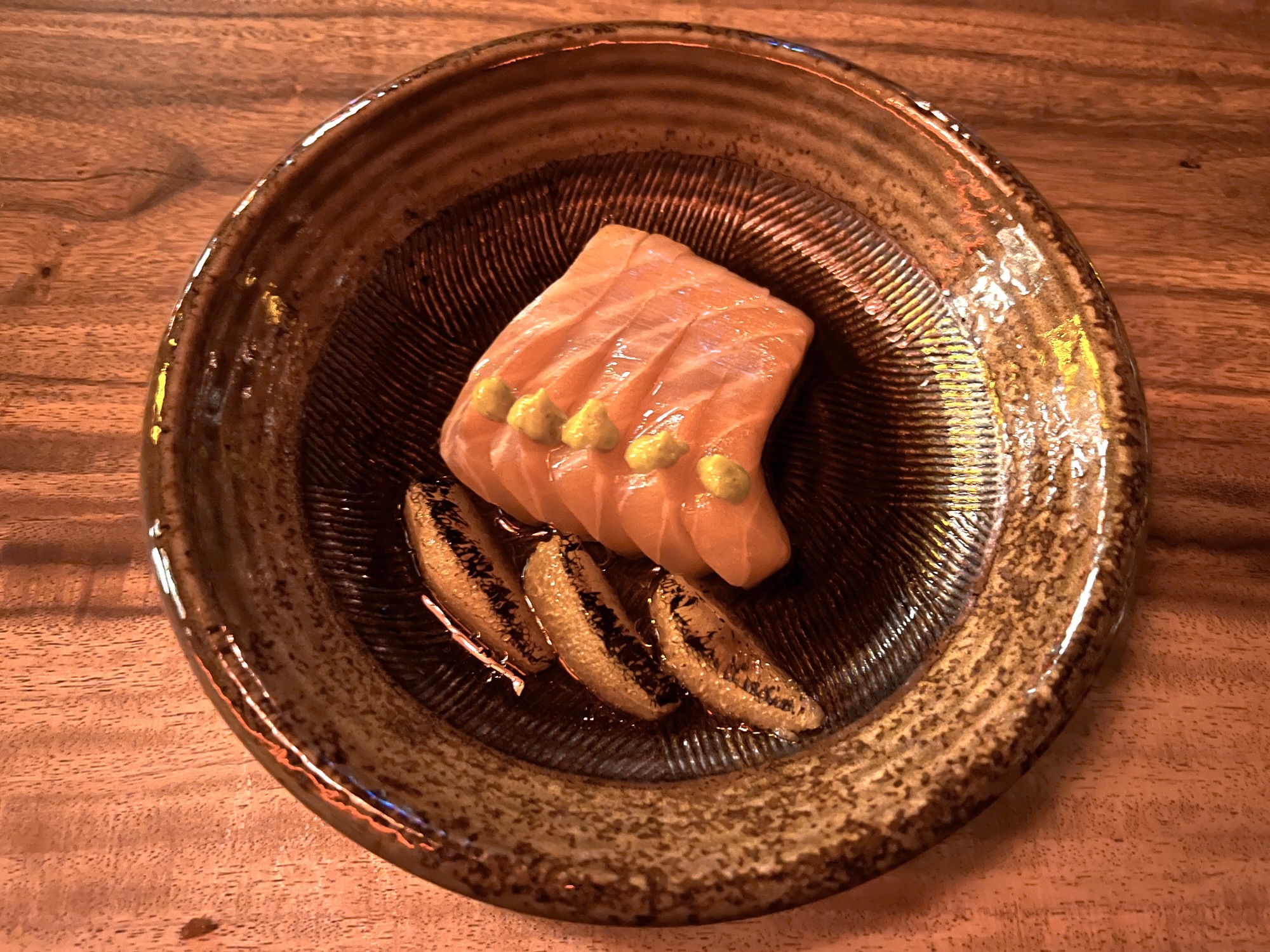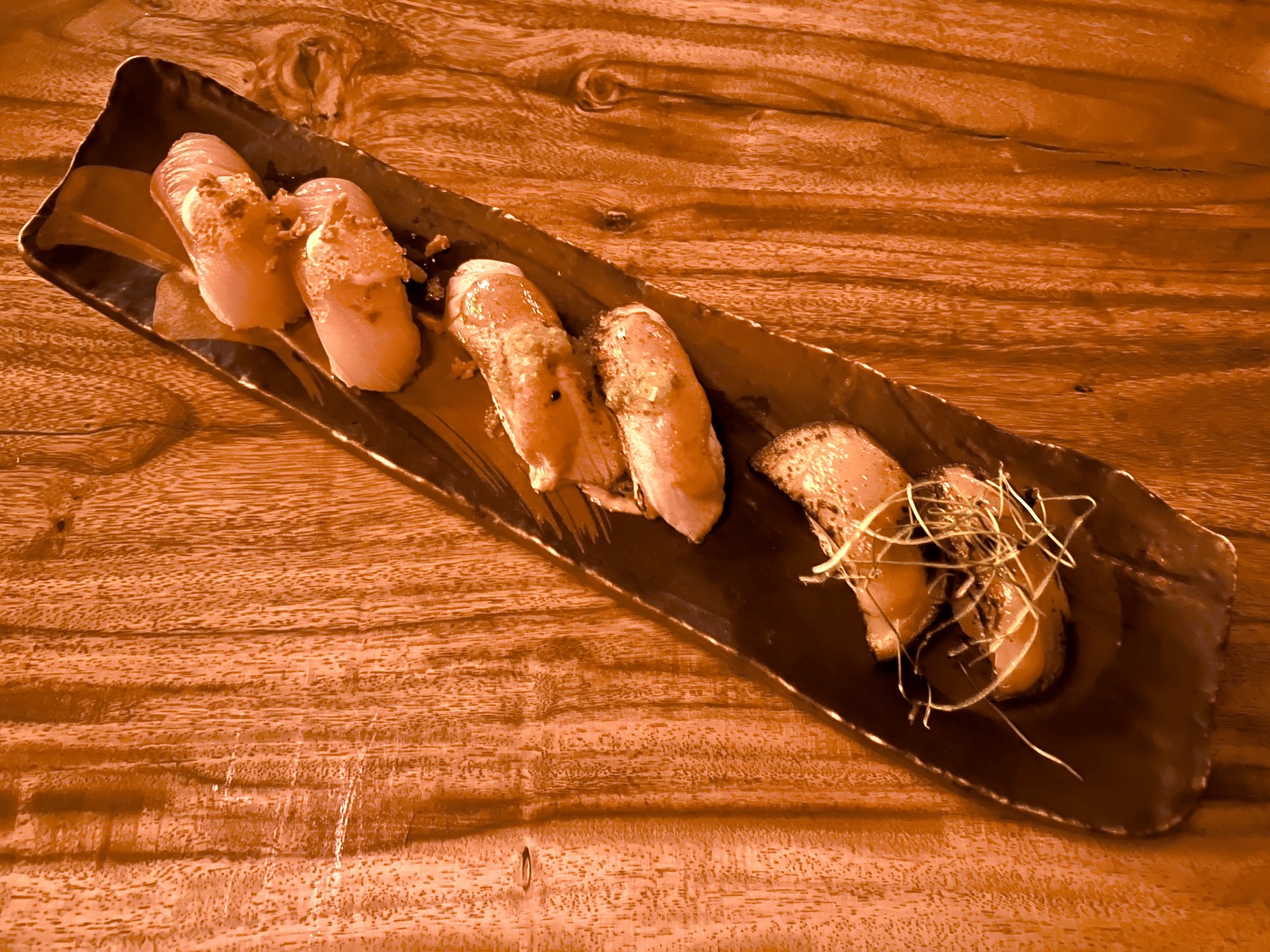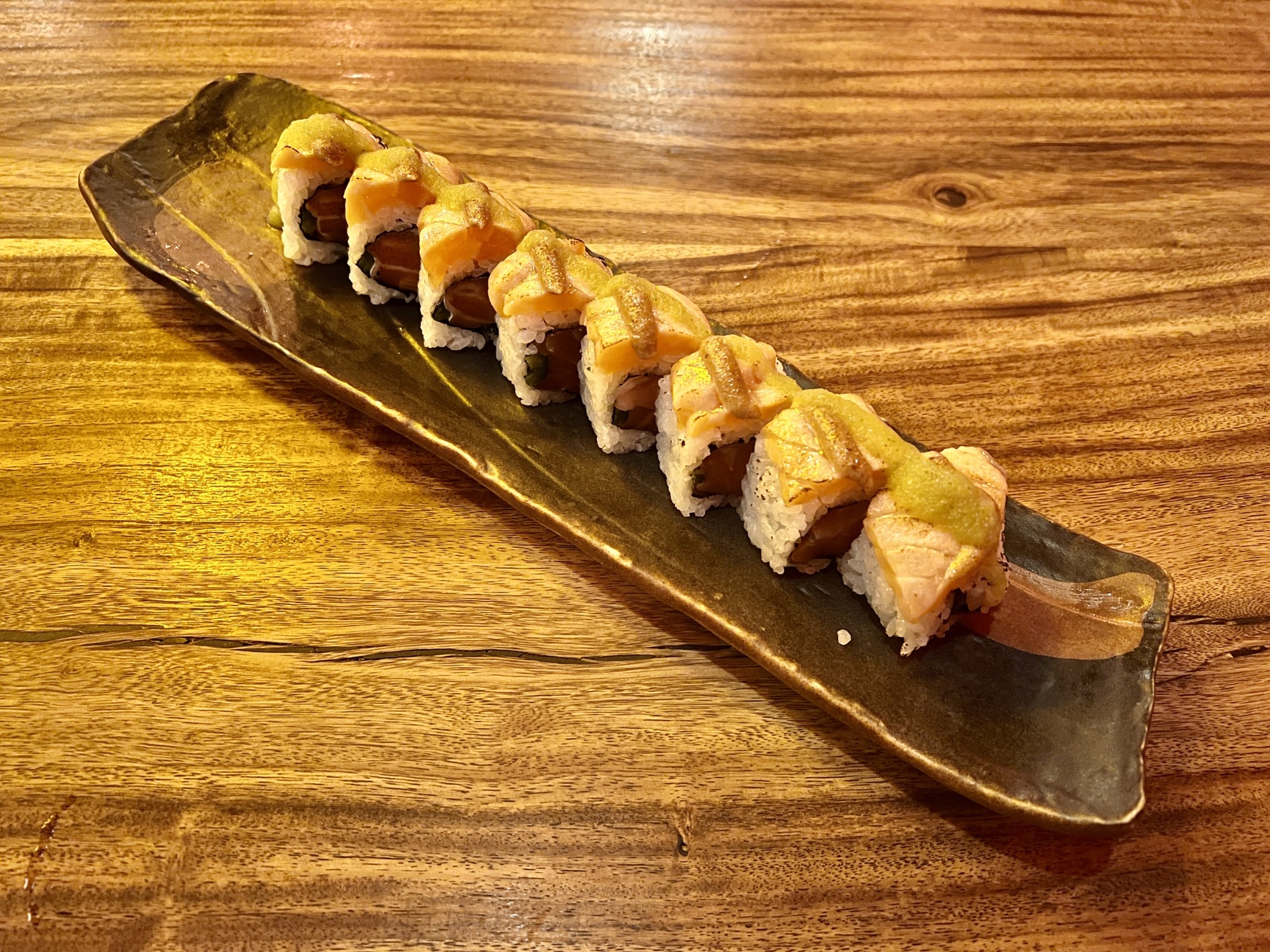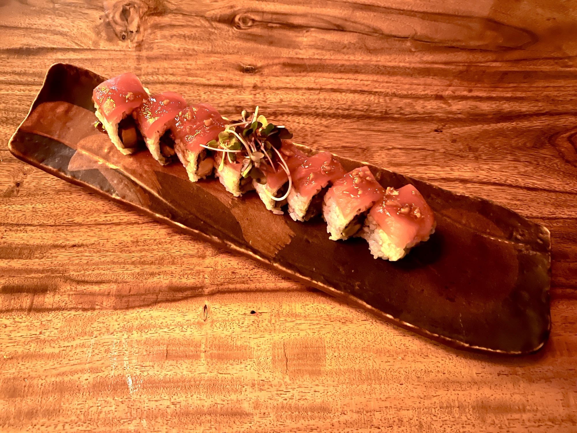 Maki, or hand rolls, number half a dozen with a special or two added sometimes. That’s a welcome contrast with the endless pages of gloppy assemblages found in many local restaurants. The Kyuubi roll is prepared with two cuts of salmon, avocado, lemon, dill, and a light “haus” aioli. The Ryujin is like a standard spicy tuna roll found on countless other menus but particularly well executed. Other rolls focus on yellowtail and eel as their proteins while the Midori roll is another vegetarian choice built upon a foundation of gently grilled eggplant.