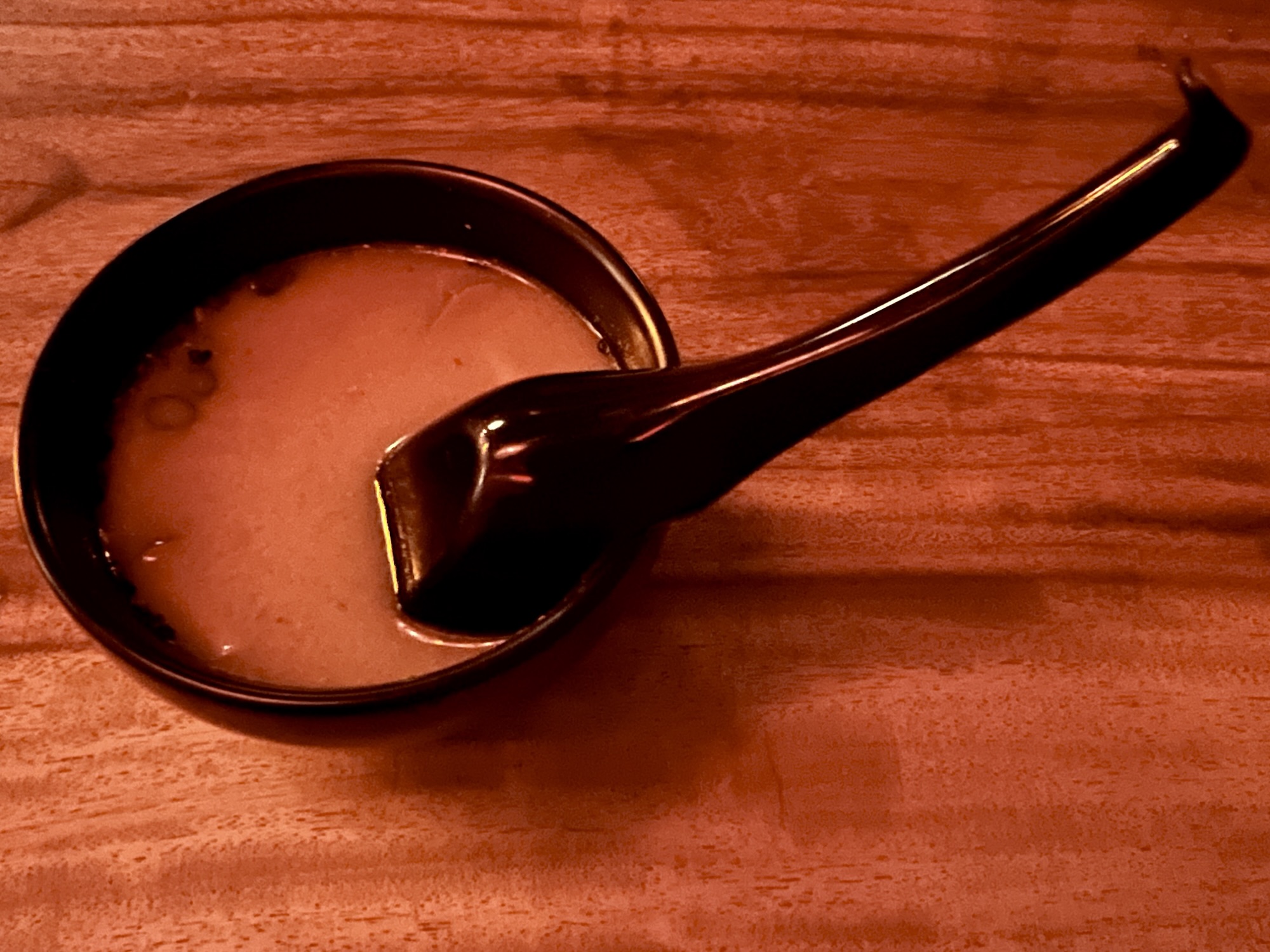 The concise menu is mostly available only by scanning a QR code, but a board by the doorway that connects the two dining rooms lists some daily specials to supplement the digital listing of regular offerings. If the online menu were printed, it would be just a single column with categories like appetizers, nigiri, and rolls. One promising beginning is Sake Haus’ original take on miso soup. With a bit of coconut milk added to the broth, it comes across as a viable hybrid of traditional miso and Thai tom kha gai, particularly when seen in the restaurant’s red glow.