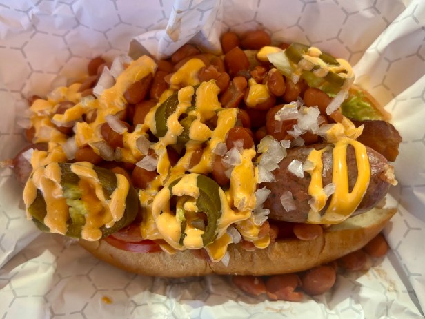 The Picnic is fun and a bit messy with baked beans, coleslaw, and an entire bag of barbecue potato chips crushed on top of it. The chili cheese uses andouille instead of a hot dog (although substitutions are always allowed) and relies on crumbled Fritos as its crunchy layer. The Sonoran also has andouille as its base and adds the usual array of Mexican-American ingredients while also departing from tradition by presenting the bacon alongside the sausage rather than wrapped around it. The Flamer goes all out with jalapeños and Flamin Hot Cheetos.