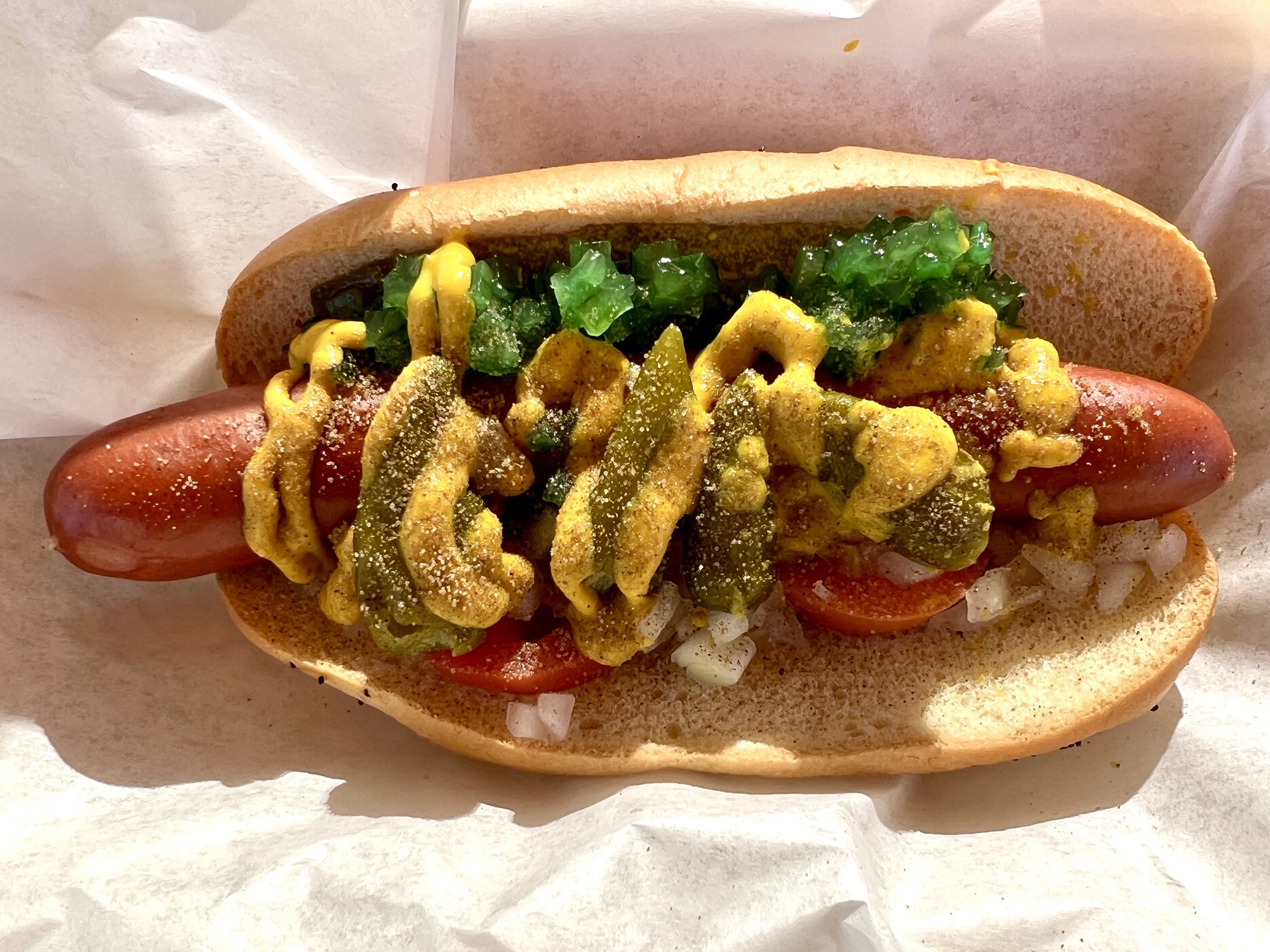 The American is straightforward with ketchup, mustard, onion, and melted cheddar. The Chicago uses toppings associated with that city: tomato, pickle, sport peppers, celery salt, onions, and mustard. One local expert on Chicago food traditions has observed that the application of mustard as a drizzle on top defies the usual sequence in which ingredients are added, so don’t expect traditionalism here. Nevertheless, this dog stands out with a tangy, slightly spicy array of ingredients in an artful presentation. The bun is of course poppy seed.