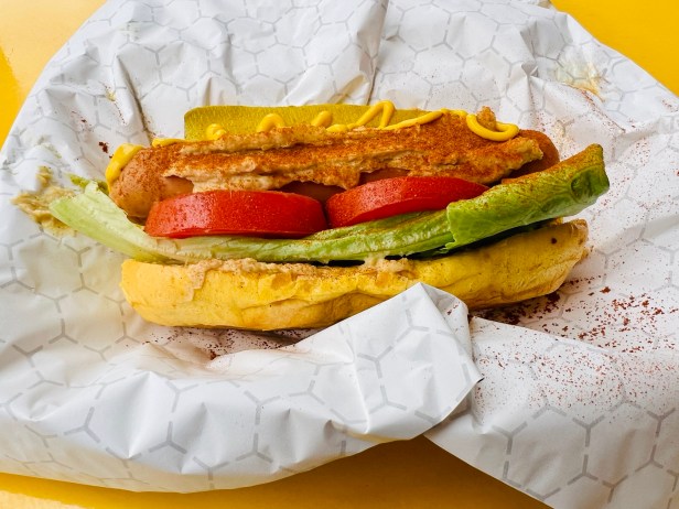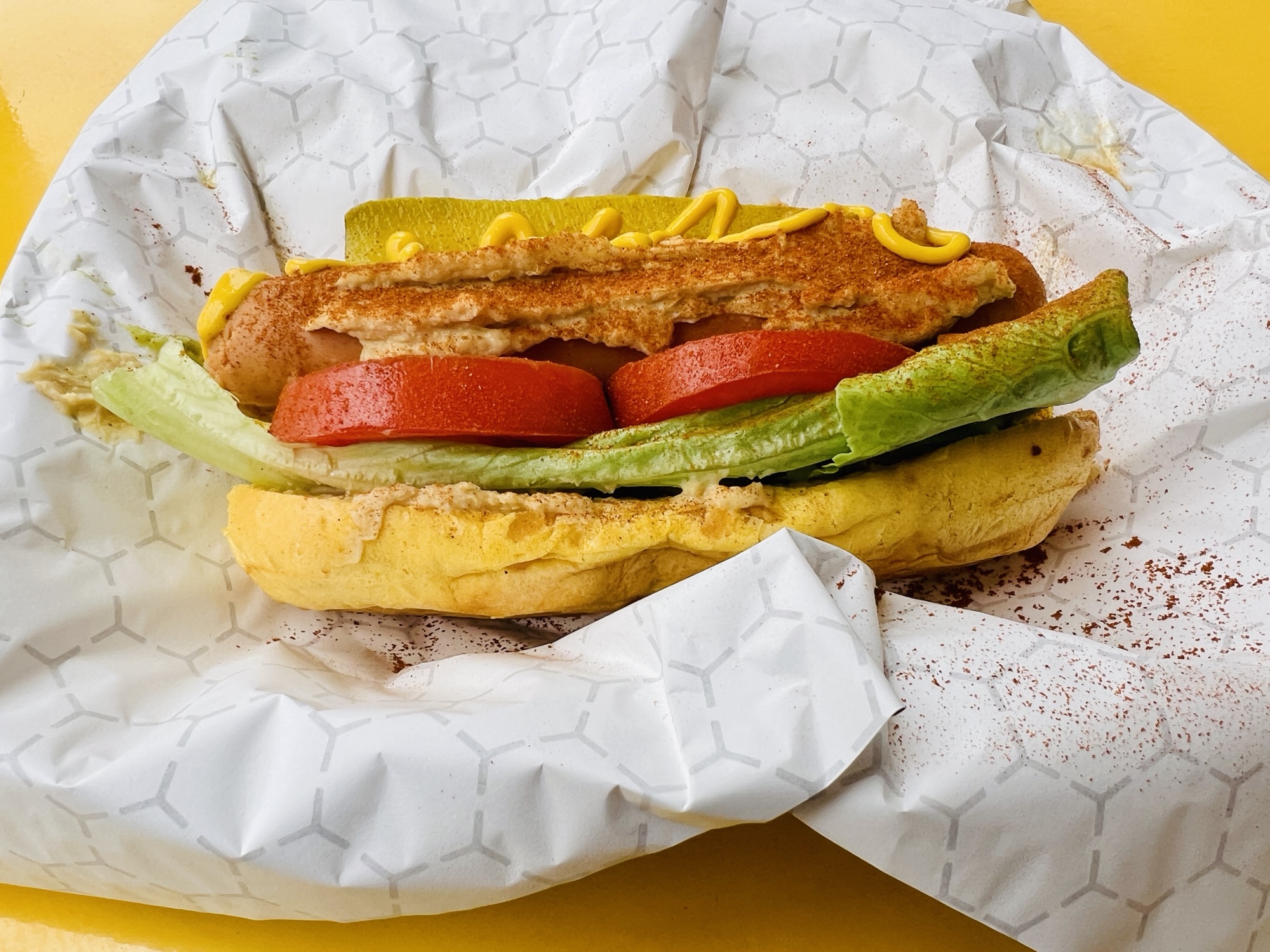 The RoRo Vegan is the sole signature dog centered around a plant-based alternative, The Smart Dog within the bun recreates the form and much of the taste of a traditional hot dog but with its soft texture, it does not have the classic snap. The toppings such as hummus dusted with smoked paprika can easily be applied to either of the meat sausages, though. In addition, any array of hot dog toppings can be served over a splayed bag of chips for a meal with no sausage at all. Toppings like chili, baked beans, and coleslaw are also available as sides.