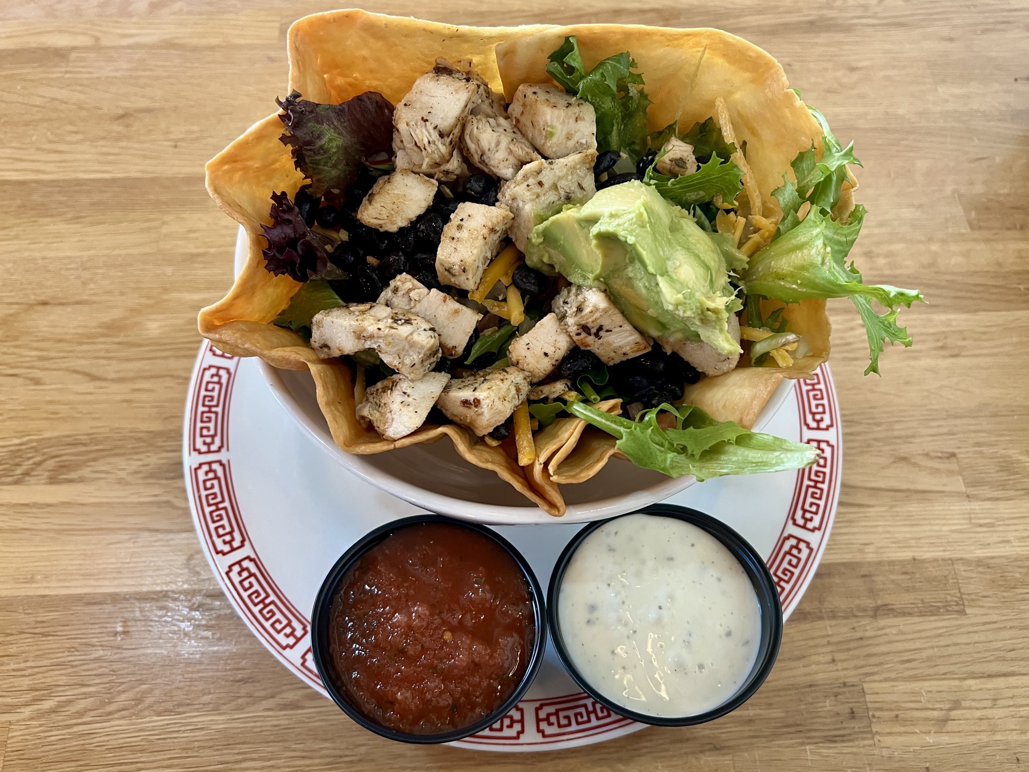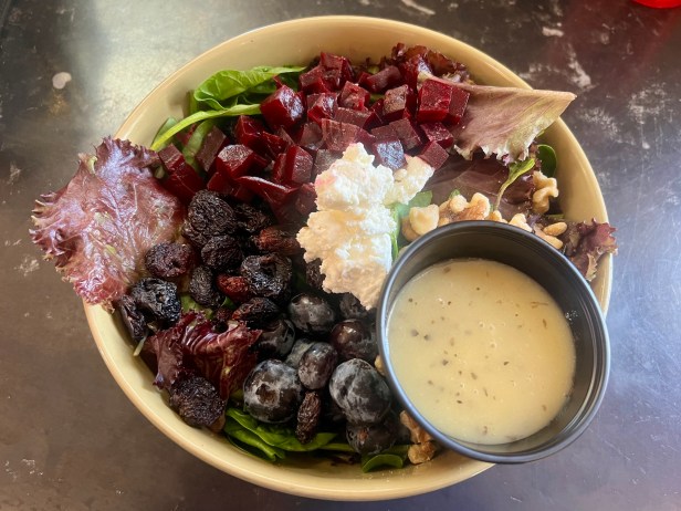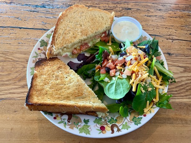 As with most places of this type, the owl’s backside is devoted to lunch entrees. Lighter fare begins with a beet salad, a standard array of cubes of root vegetables over lettuces with walnuts, fresh blueberries, dried cherries, and goat cheese. A taco salad is a bit more hearty with a choice of chicken or chorizo with greens and black beans. Likewise, the Cobb salad incorporates the expected hard-boiled egg with bacon, feta, and chicken over a spring mix base. These can be customized with meat additions or subtractions, as well as vegan modifications.
