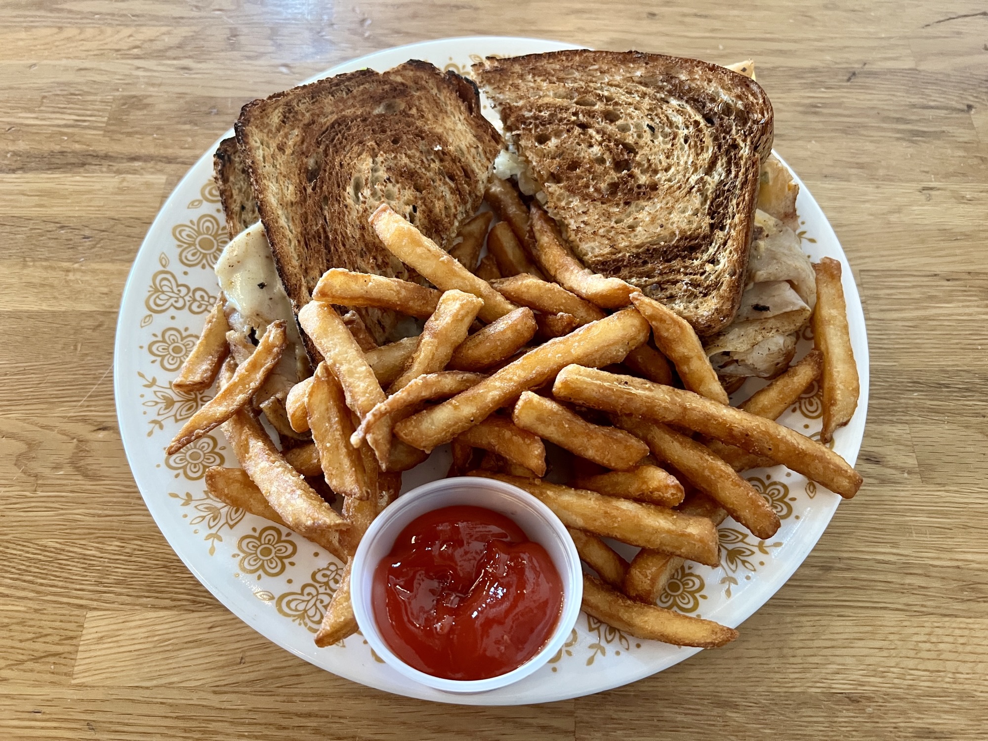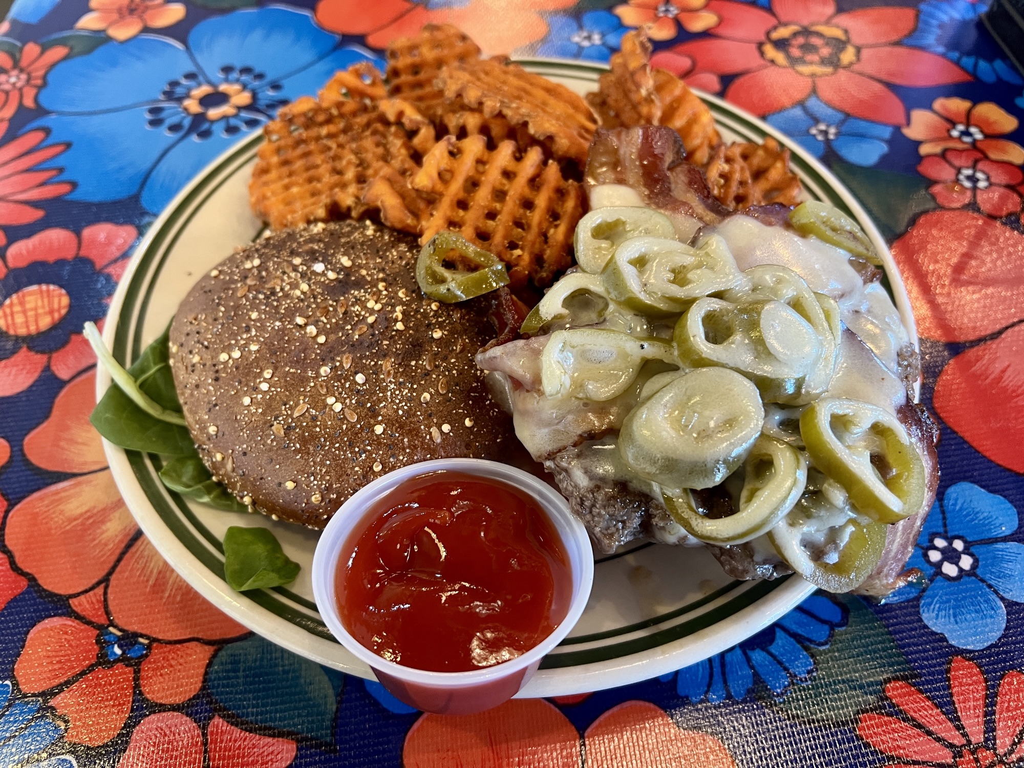 Even the menus, both the main one and the parallel plant-based one, are shaped like the silhouette of an owl. The food is for the most part standard breakfast and lunch diner fare with a few Southwestern touches. It’s consistently competent, even if not particularly innovative or exciting. Breakfast fare includes standards like pancakes and waffles with sides like sausage or bacon. Eggs are generously represented in omelettes and “scrambles” with all sorts of added ingredients like brie, cheddar, prosciutto, chorizo, mushrooms, and roasted vegetables.