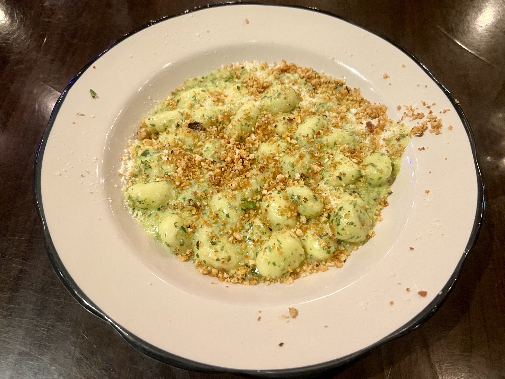 Spaghetti is available in two formats:one with a tangy pomodoro sauce and the other with a garlic and olive oil combination enhanced with parsley, chilli, flakes and bread crumbs. The fourth and final pasta entree is gnocchi pesto with a pleasingly supple texture and intense flavor from basil and parmesan. All of the pastas have a toothsome touch in fulfillment of the restaurant’s “al dente or die” motto. Portions are somewhere between Ozempic and the Olive Garden. In other words, they provide a filling meal but not a guaranteed source of leftovers.