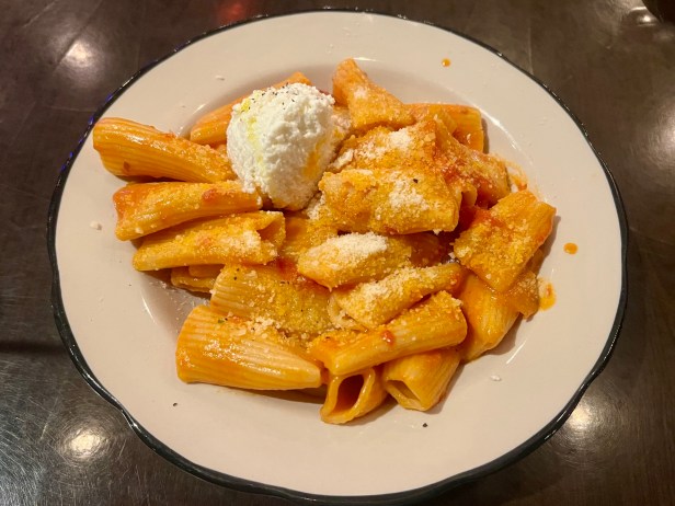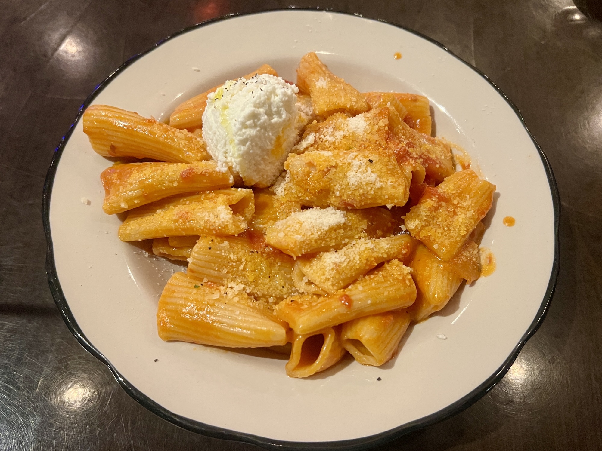 Garlic pinsa is a flavorful flatbread, similar in shape to Indian naan, generously dusted with salt, garlic, herbs, and parmesan. Similarly seasoned Vampire Slayer fries fill much the same role with potatoes rather than wheat as the starch and lemon dill aioli served on the side for dipping. Of course, pasta is what virtually everyone comes here for, and there are four options available. The first and most popular is the rigatoni vodka in which ridged tubes of pasta are served in a tomato sauce simultaneously mellowed via slow cooking and sharpened by a little bit of booze.