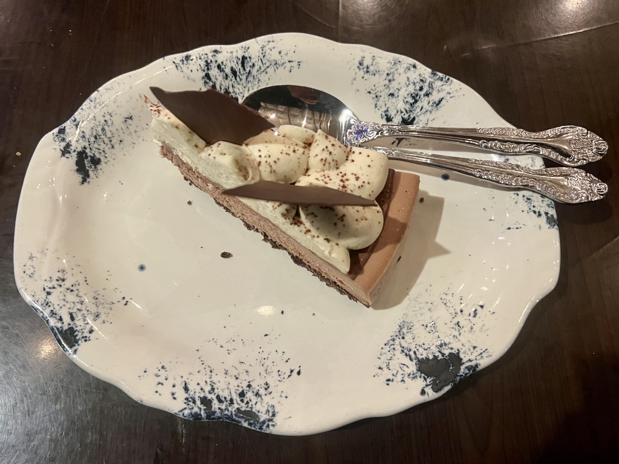 After all the pasta and chicken, there is only dessert, but it’s one that fits well with the Italian-American theme. Obtained from local farmers market favorite Chaconne Patisserie, the stracciatella cheesecake has a New York style base layer with strata of creamy mascarpone and a light ganache bounded by a cookie crust on the bottom and chocolate shavings on top. The bar serves its own cocktail creations such as the Homie Hopper with tequila, fruit, and coconut water; a “Saintspresso” martini, and a distinctive blue version of the familiar negroni.
