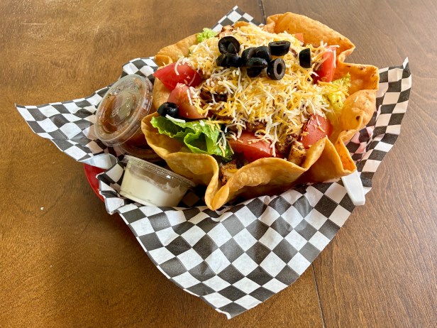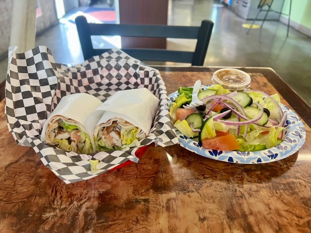 Southwestern dishes include a bountiful taco salad with a choice of the same beef used in bulgogi or chicken in shawarma or teriyaki. A Southwestern chicken wrap presents a nice contrast between crisp, smoky bacon and creamy avocado. There are also fish tacos, which are presented almost as fish sticks inside tortillas with rectangular slabs of white flesh breaded, fried, and matched with a mild white sauce, julienne carrots, and shredded cabbage. They gain an extra dimension of flavor when accessorized with a drizzle of Frank’s RedHot sauce.