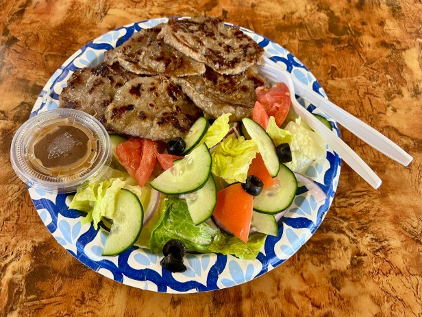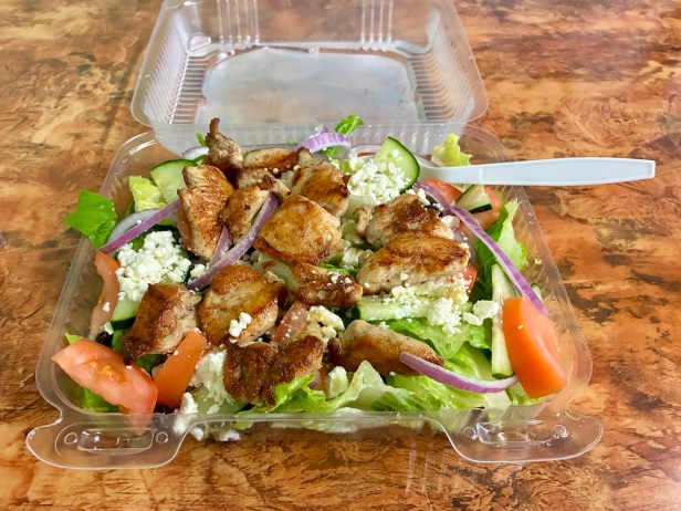 The shawarma comes in a wrap and is accessorized with a flavorful garlic sauce. The Mediterranean salad eliminates the bread and instead involves the same preparation of poultry on top mixed greens with cucumbers, tomatoes, onions, and feta cheese. The teriyaki is served over steamed white rice with a drizzle of sauce to supplement the marinade and abundant vegetables. The bulgogi incorporates thin, tender, lightly marinated beef over rice with a side salad. The same meat also appears in chopped form as the filling inside fried pot stickers.