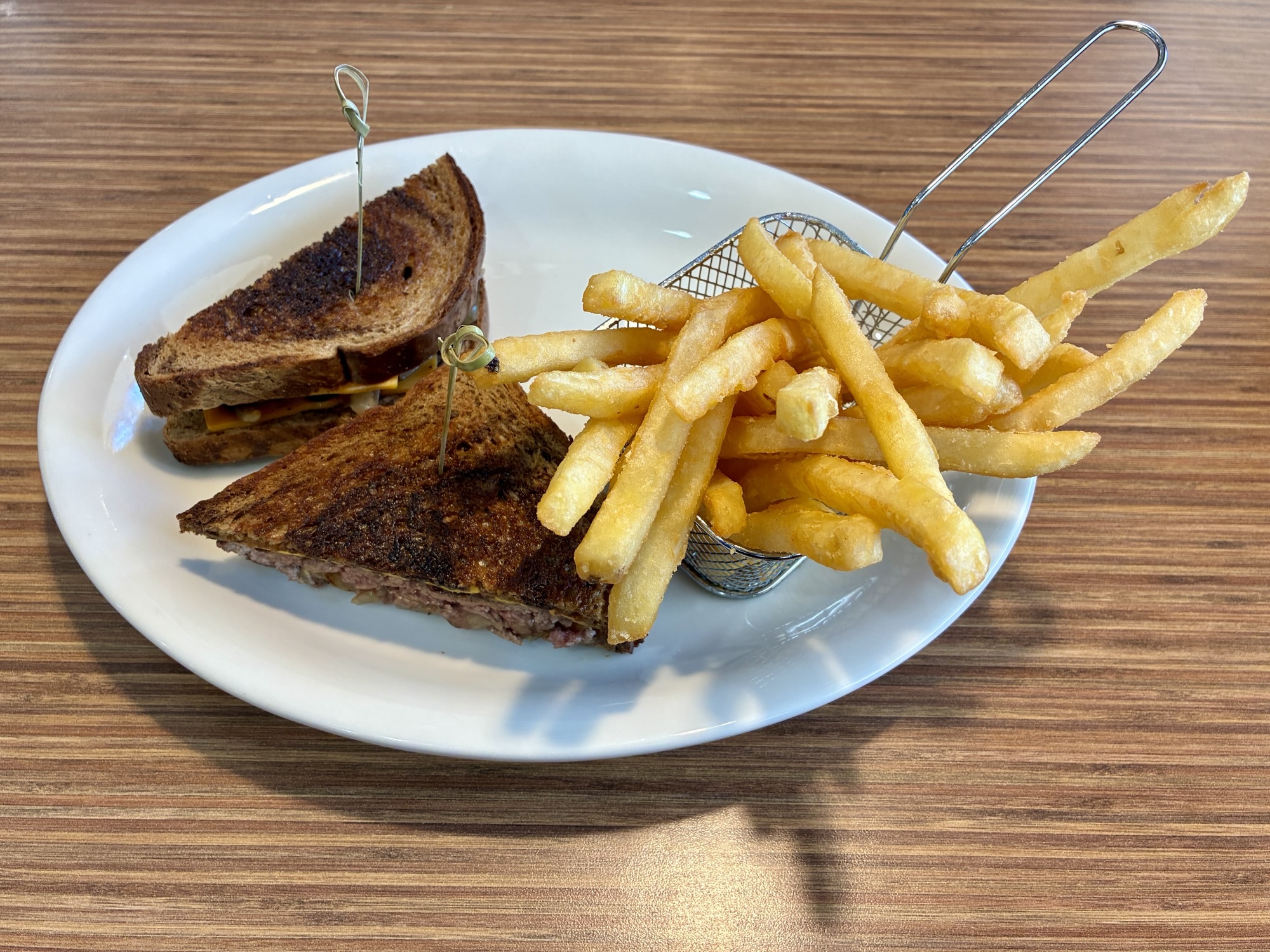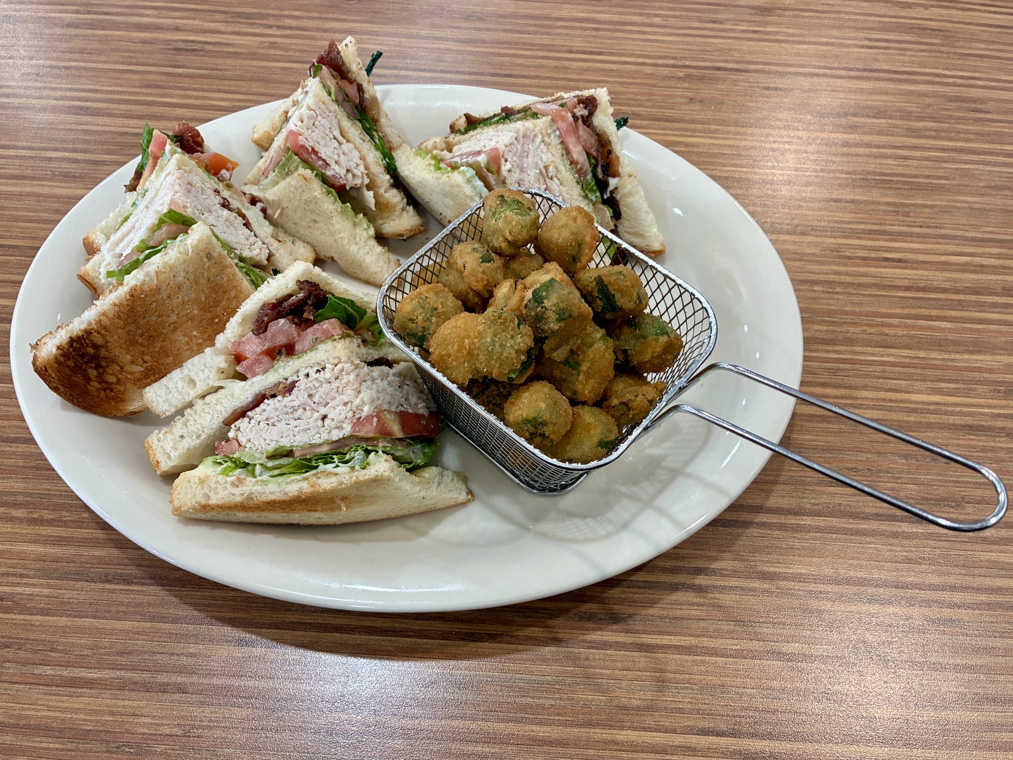 Those soups are an appealing preclude to a menu that include successful sandwiches like a three-layered turkey bacon club, a vivid version of a classic with abundant turkey, crisp bacon, and fresh tomatoes on toasted white bread spread with mayonnaise. The burger menu includes both a classic patty melt, albeit made with American cheese rather than the more traditional Swiss, and an A1 patty melt that adds the steak sauce of that name and bacon to the mix of elements between slices of rye. All sandwiches come with a side of either fries or fried okra.