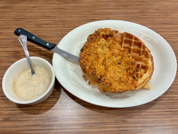 If chicken and waffles begin the transition from breakfast to lunch, it’s the burgers, sandwiches, and salads on the menu that make it fully realized. First, though, there’s soup. With all lunch entrees, the restaurant offers a complimentary cup of the day’s soup, which is usually announced on the whiteboard near the entrance. Each day’s creation can be something as simple as a piquant tomato bisque or as clever as a Philly cheesesteak soup in which a smooth base of melted cheese is enhanced with bits of grilled ribeye, bell peppers, and sautéed onions.