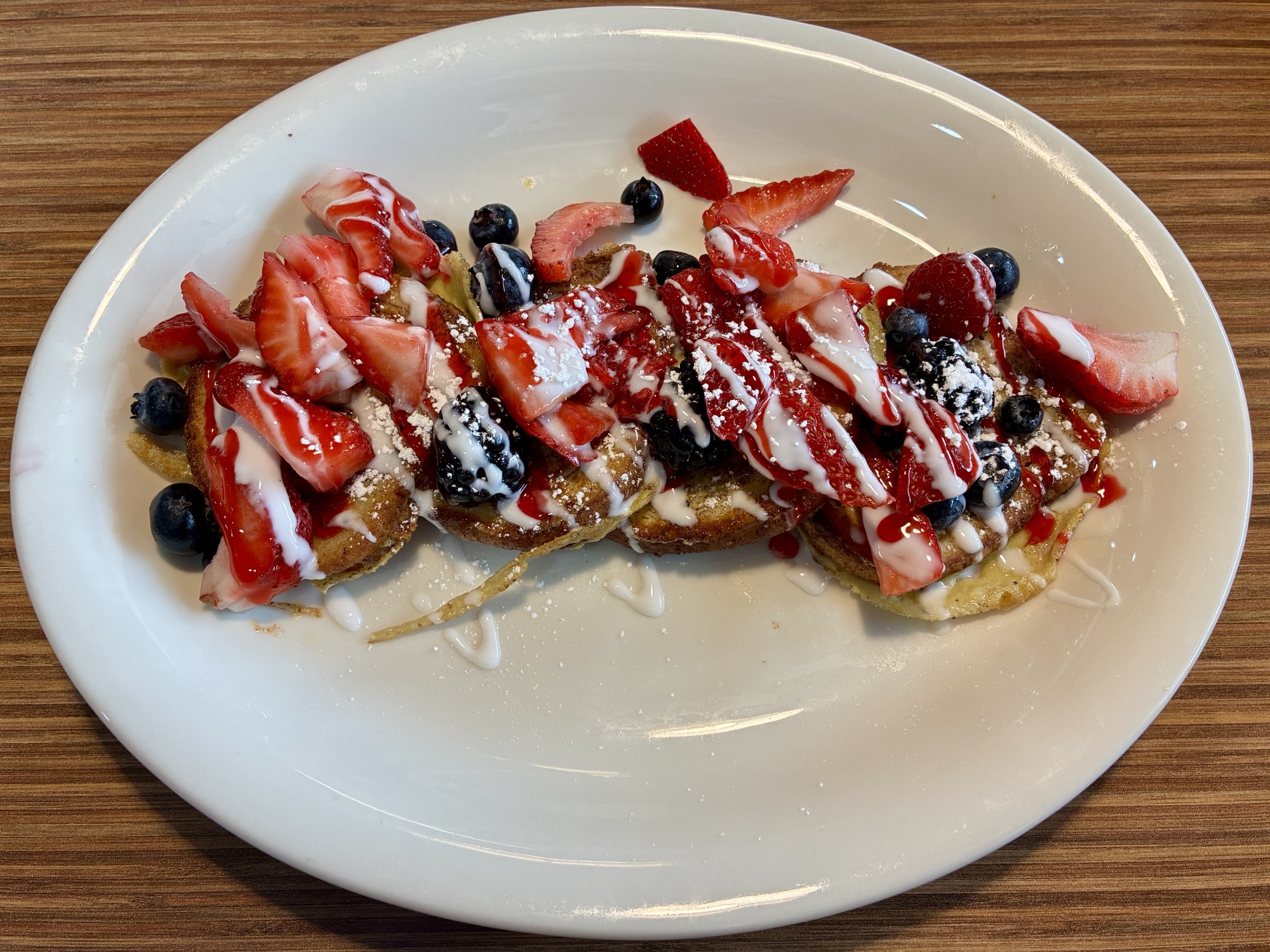As expected for a place that opens at 7AM, the menu begins with a heavy breakfast focus. That means seven or eight different varieties of omelettes and eggs Benedict, as well as the usual starches like pancakes, waffles, French toast, and crepes. There are so many variations of these that a sampler may be an effective way to start. The crepe sampler is a trio with one crepe in each of the following variations: mixed berries, fruit and cream, and banana and strawberry with Nutella. Some of these ingredients fill the crepes, others top them, and some do both.