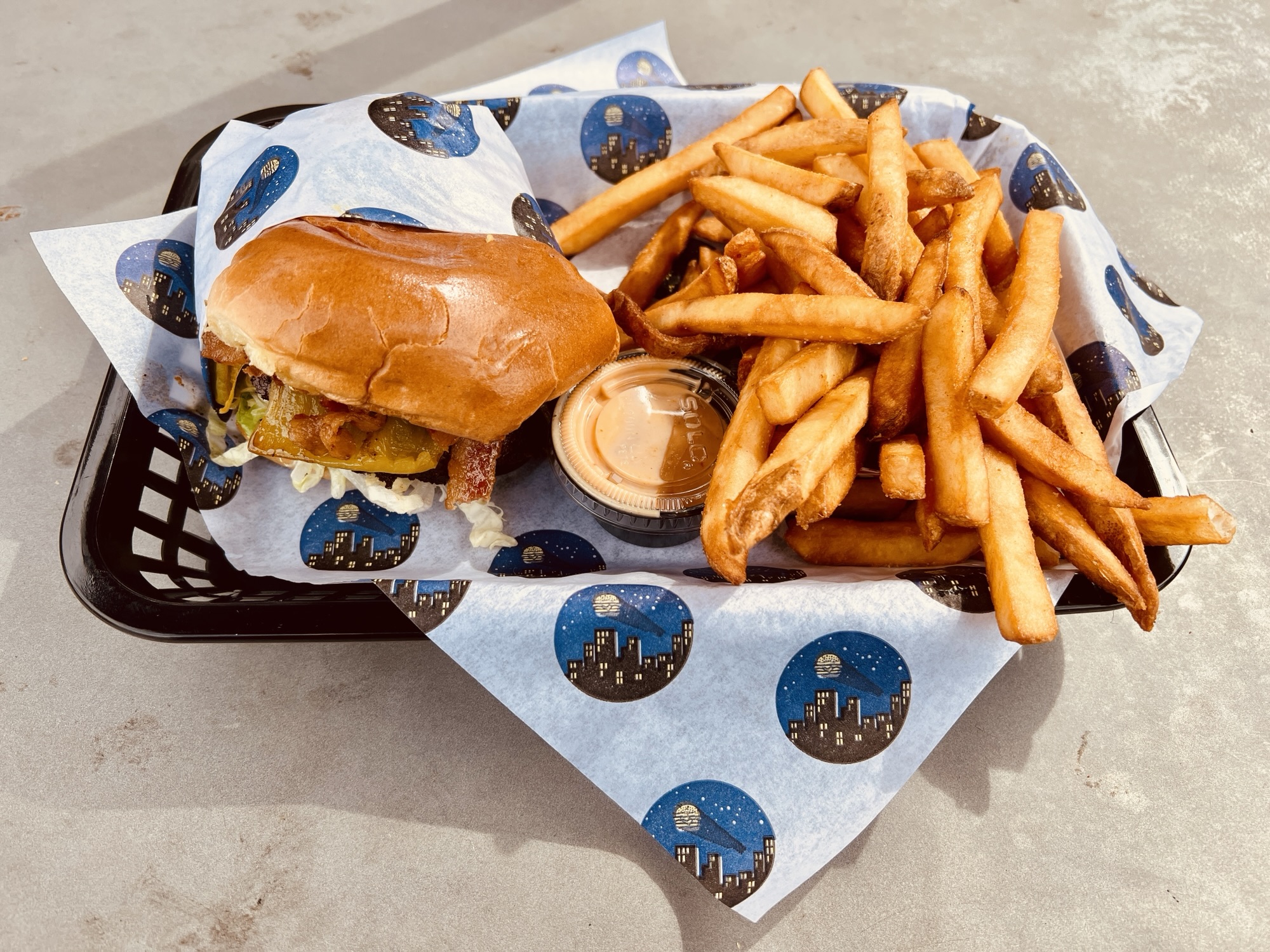 After several years of operating primarily on a delivery and takeout basis in the Tempe Food Hall, which is mostly ghost kitchens with limited seating, this burger place relocated to a strip mall space across the street from Priest/Washington station on the A Line. The location is at the edge of Tempe, just a few blocks from the Phoenix city line and Papago Park. In fact, the small shopping center that houses 5th Street and several other restaurants is called “Papago Park Center.” Bike racks are found outside the Starbucks that anchors the plaza at its southern end.