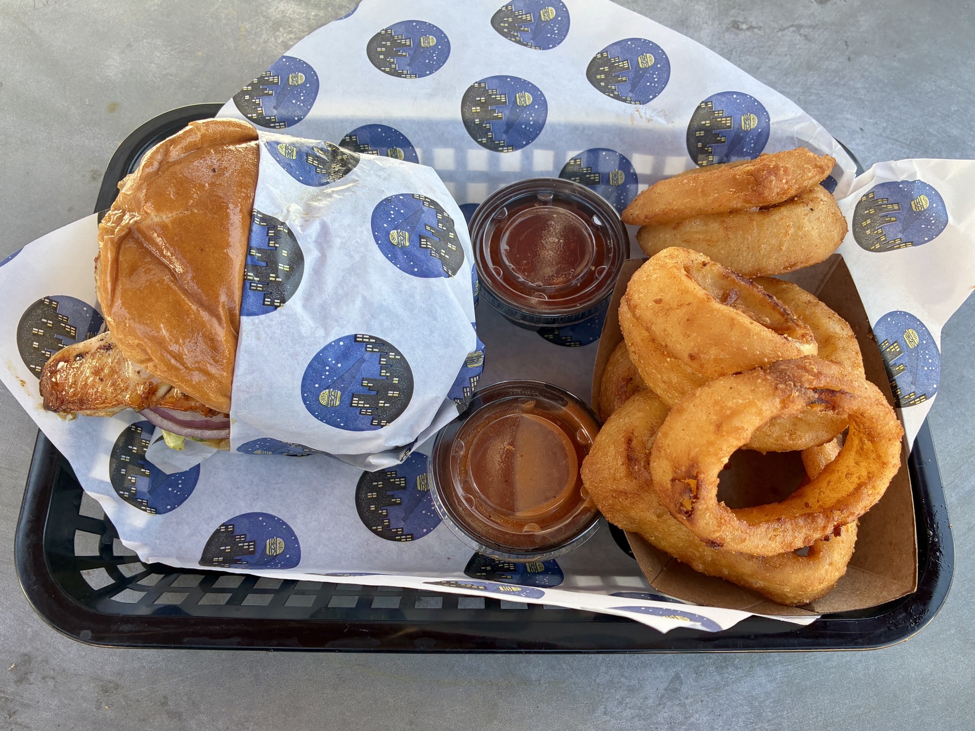 The poultry counterpart to the burgers is an array of chicken sandwiches in which three tenders take the place of a single patty. They’re generally good but in some cases so thick that they are tender in most places but chewy in a few. Typical preparations include tangy Buffalo chicken and Nashville-style hot chicken, either dipped or dusted, a reference to how the spice is applied before cooking. The Hawaiian chicken sandwich contains three unbreaded tenders with abundant red onion and lettuce with some pineapple rings. Teriyaki sauce is served on the side.