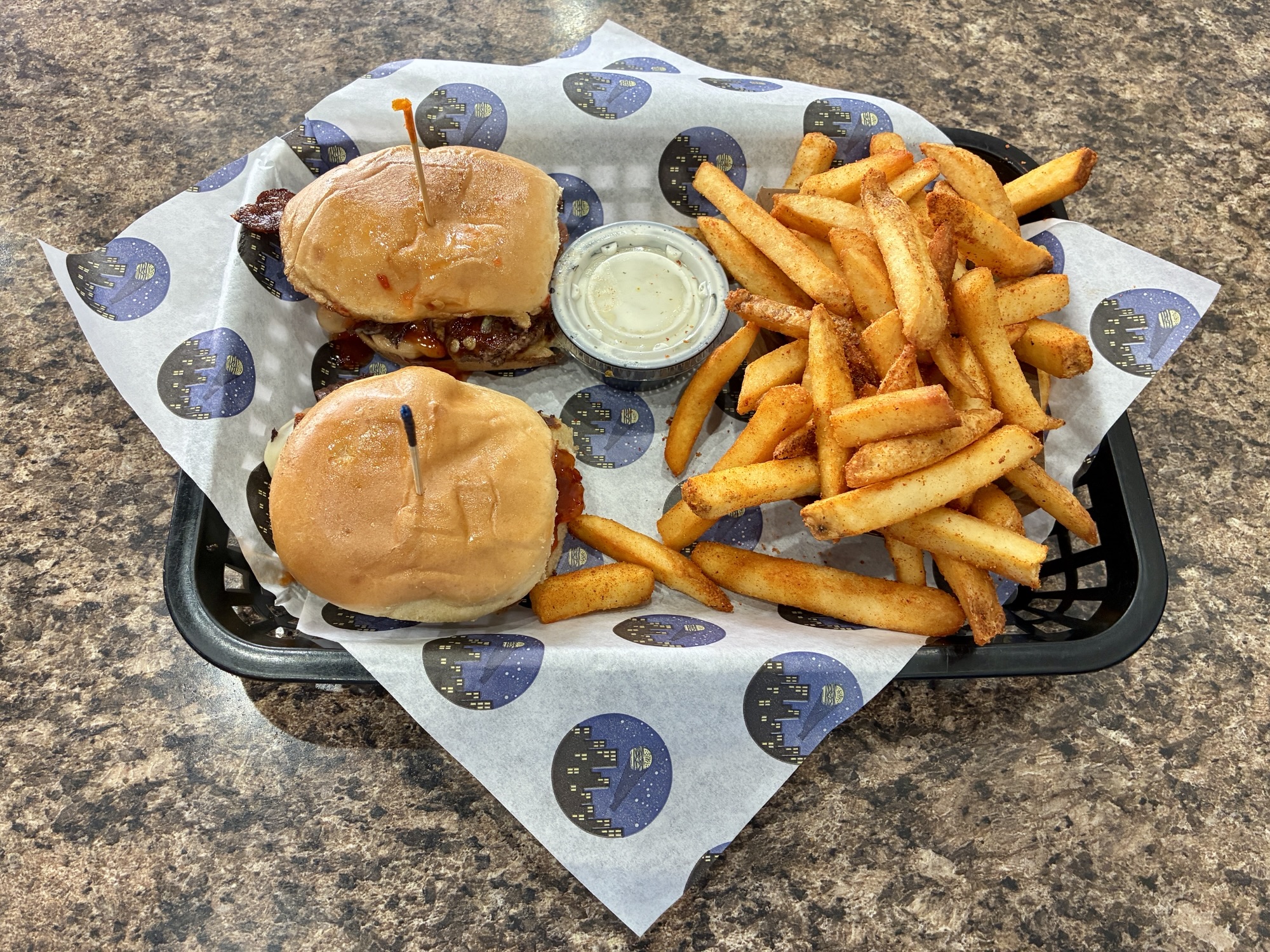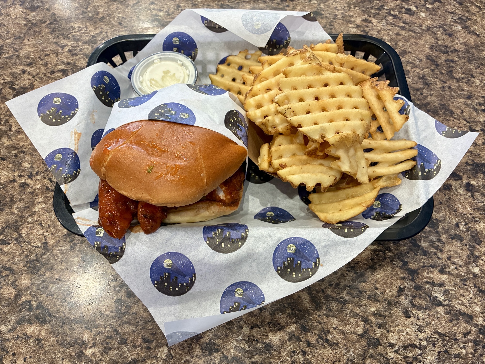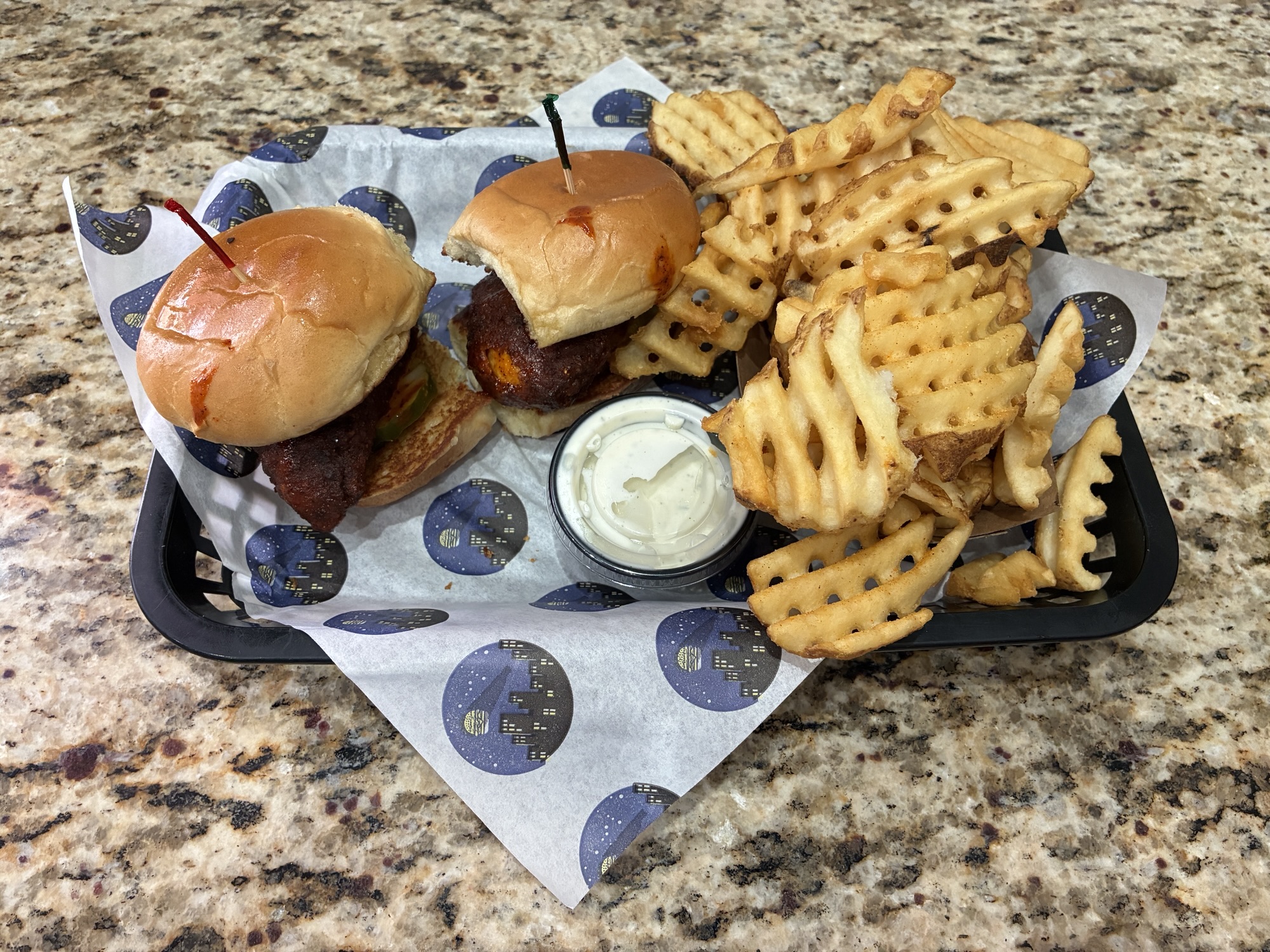 Nashville, Buffalo, or barbecue flavors. Then, there is a secondary choice of whether that should take the form of dry seasoning or dipping in sauce. The Nashville option has a sneaky burn with some sweet pickle slices and ranch to cool things down. All burgers, sandwiches, and sliders can be upgraded to a combo meal with a fountain drink and choice of side. Options include fries with plenty of skin left of the potatoes, waffle fries, sweet potato fries, and onion rings.
