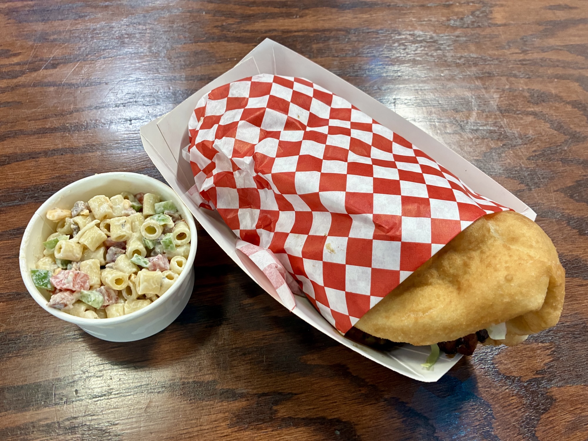 Other entrees are fashioned with fry bread folded around a filling. The Navajo burger is exactly what it sounds like: a choice of one or two beef patties encased in fry bread and accessorized with onions, tomatoes, lettuce, mayonnaise, and ketchup. The lamb sandwich is a nod to the role of mutton in the traditional Diné diet and is assertively flavored with green chili. The Asian Persuasion has thin, tender chicken breast in a sweet, slightly spicy teriyaki marinade with fresh cabbage and pineapple rings. All sandwiches come with a side of beans, chips, or pasta salad.