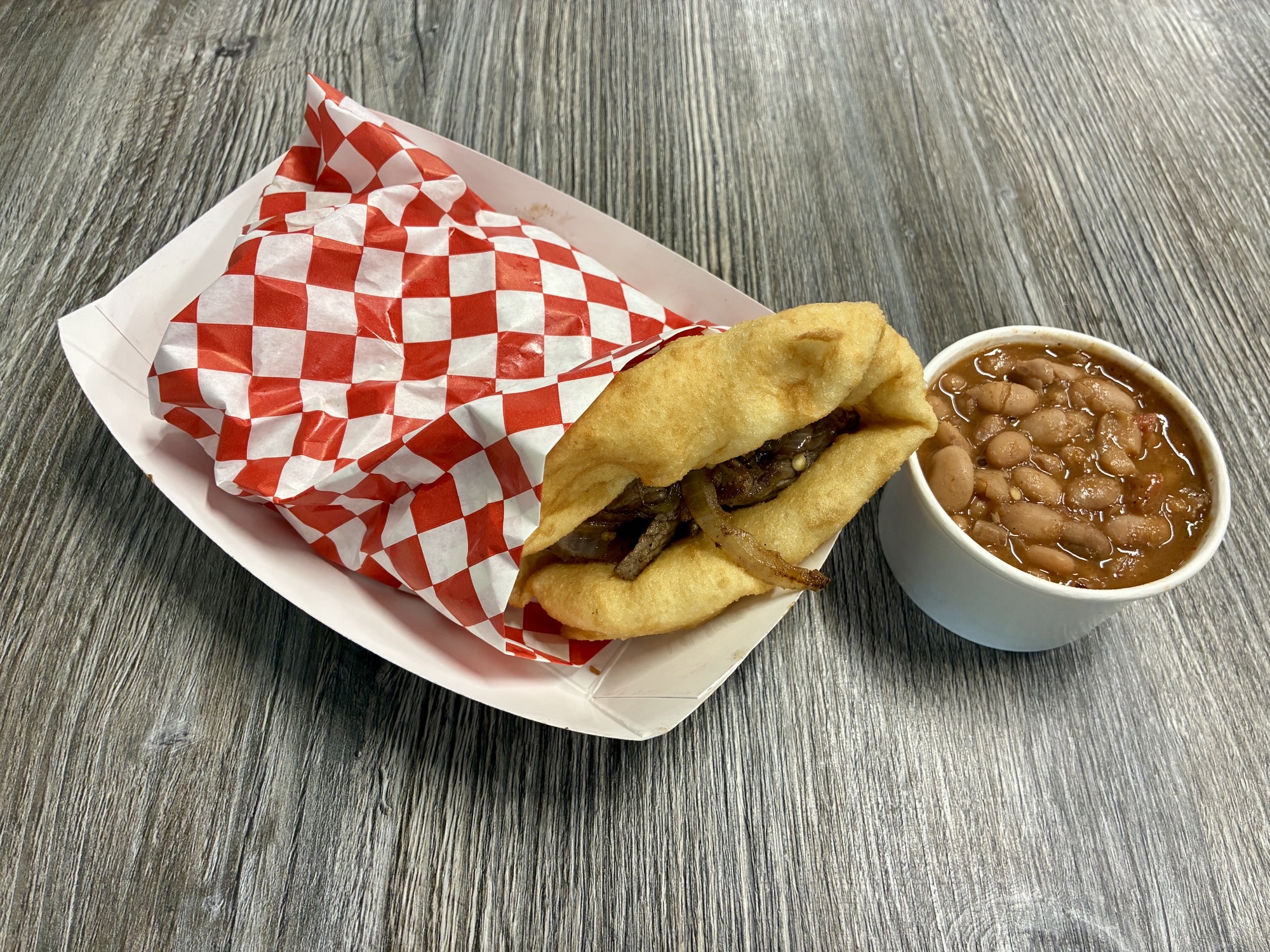 At the most basic level, it’s possible to order an unadorned piece of fry bread with a side of chili beans. This is a good option for a first-time exploration of the bread’s nuanced texture, which is slightly crisp but also airy without excessive greasiness. The chili beans are a mildly spiced combination of pintos with ground beef and spices with topping of onions and cheese. These ingredients, along with salsa and lettuce, all come together in Hope’s version of a Navajo taco, an open-faced favorite at events like the Arizona State Fair and numerous roadside stands.