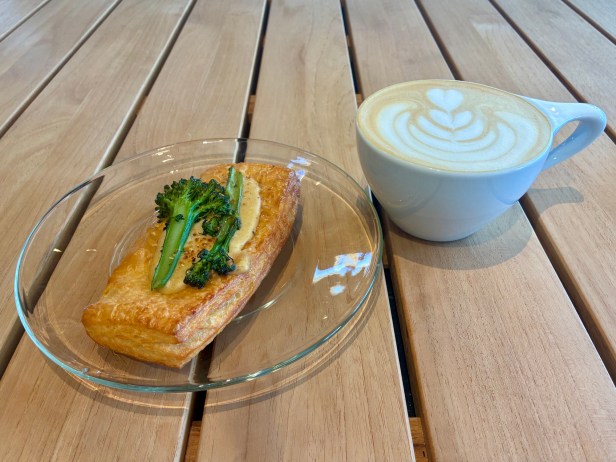 For something warm, a sweet potato latte is subtle with a muted vegetal flavor and an unassuming layer of marshmallow foam. A hazelnut latte with banana foam has both fruit nut and fruit flavors that are both restrained and authentic. For anyone who wants to literally go bananas, a thick piece of banana bread with intact slabs of the tropical fruit within, is an obvious companion. Croissants are also an essential pastry item here, whether sweet with sliced almonds on top and a marzipan filling, or savory with a mixture of ham and gruyere cheese.