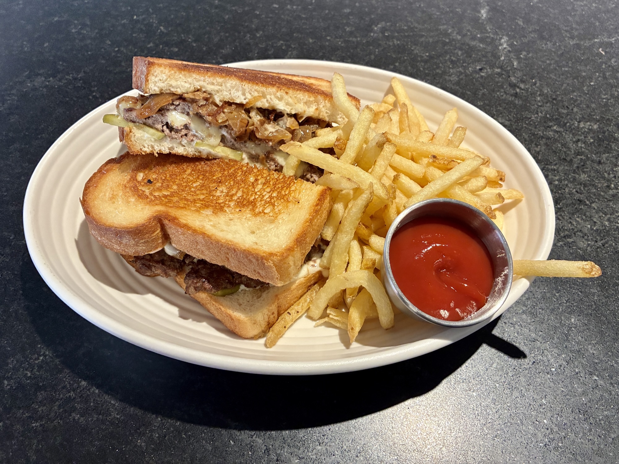 Sandwiches also showcase international influences. Alden’s version of a patty melt nearly overflows with copious grilled onions lending plenty of umami that is augmented with a melted blend of sharp cheddar and gouda, as well as tangy pickles. KFC buns, essentially Korean fried chicken served in bao come as a duo, each filled with thin, crisp poultry dressed with sesame seeds, pickles, and a drizzle of sweet chili sauce. A vegetarian option is grilled cheese with its typical companion of tomato soup. All salads come with fries or a small Caesar salad.