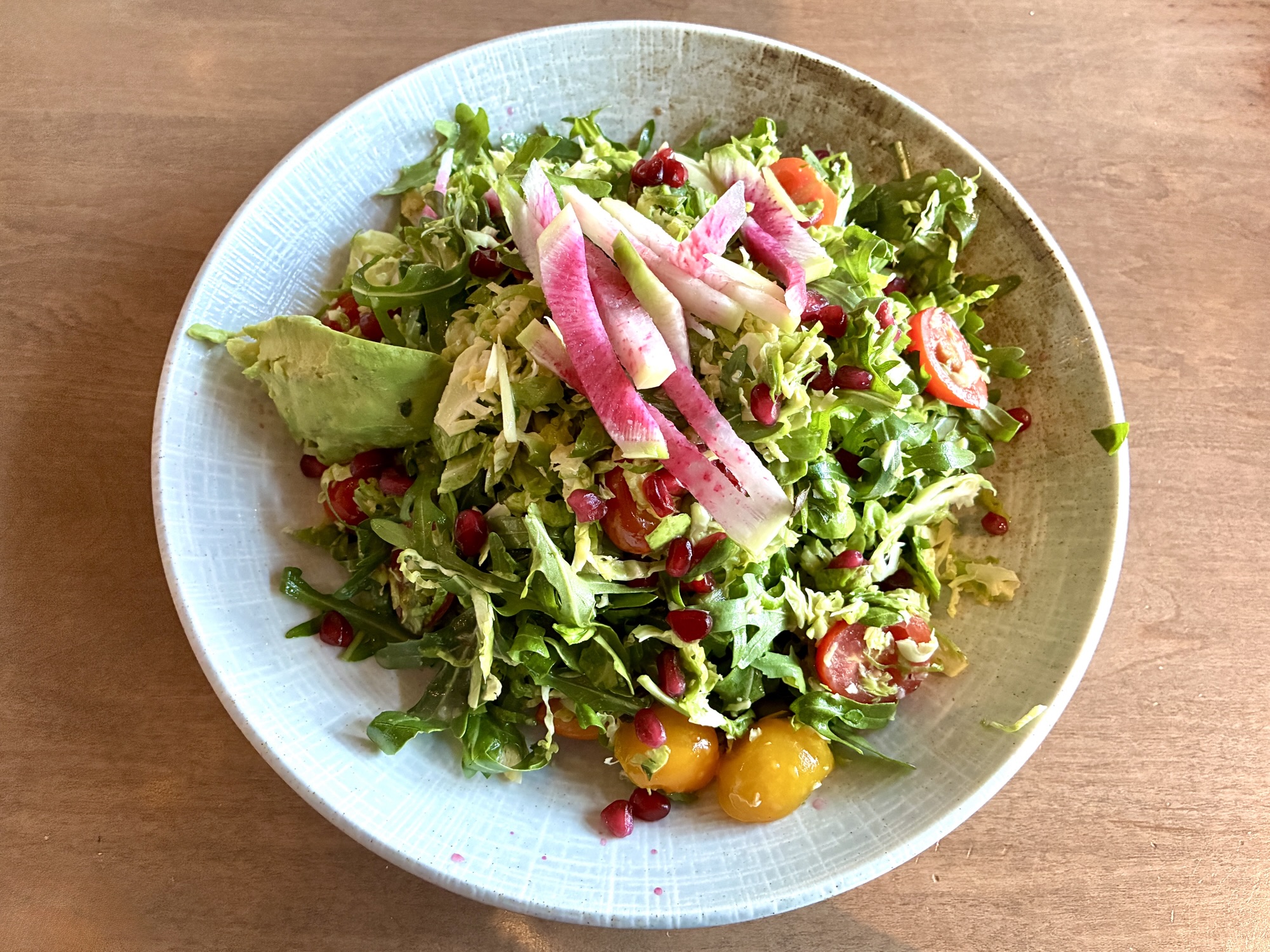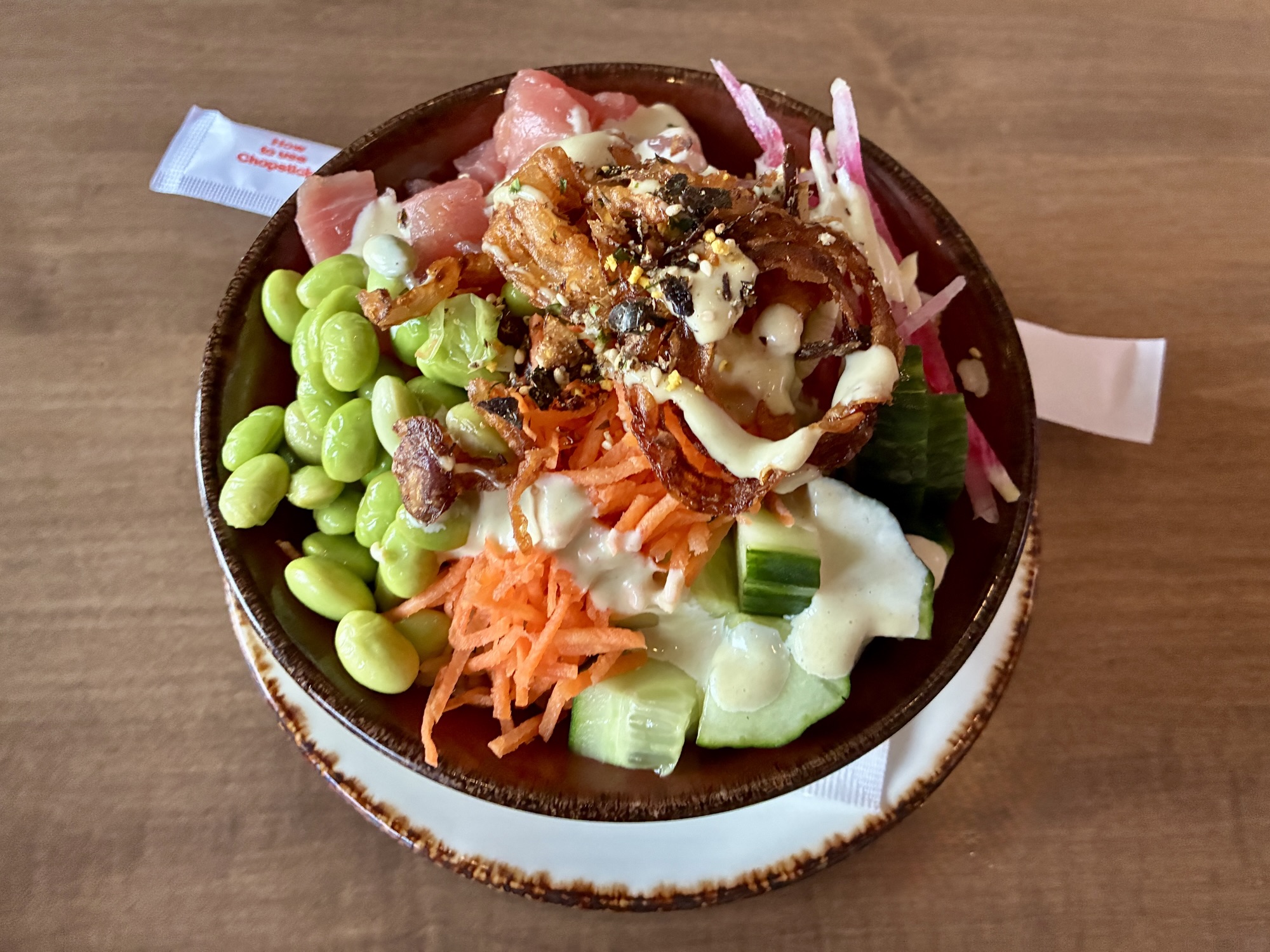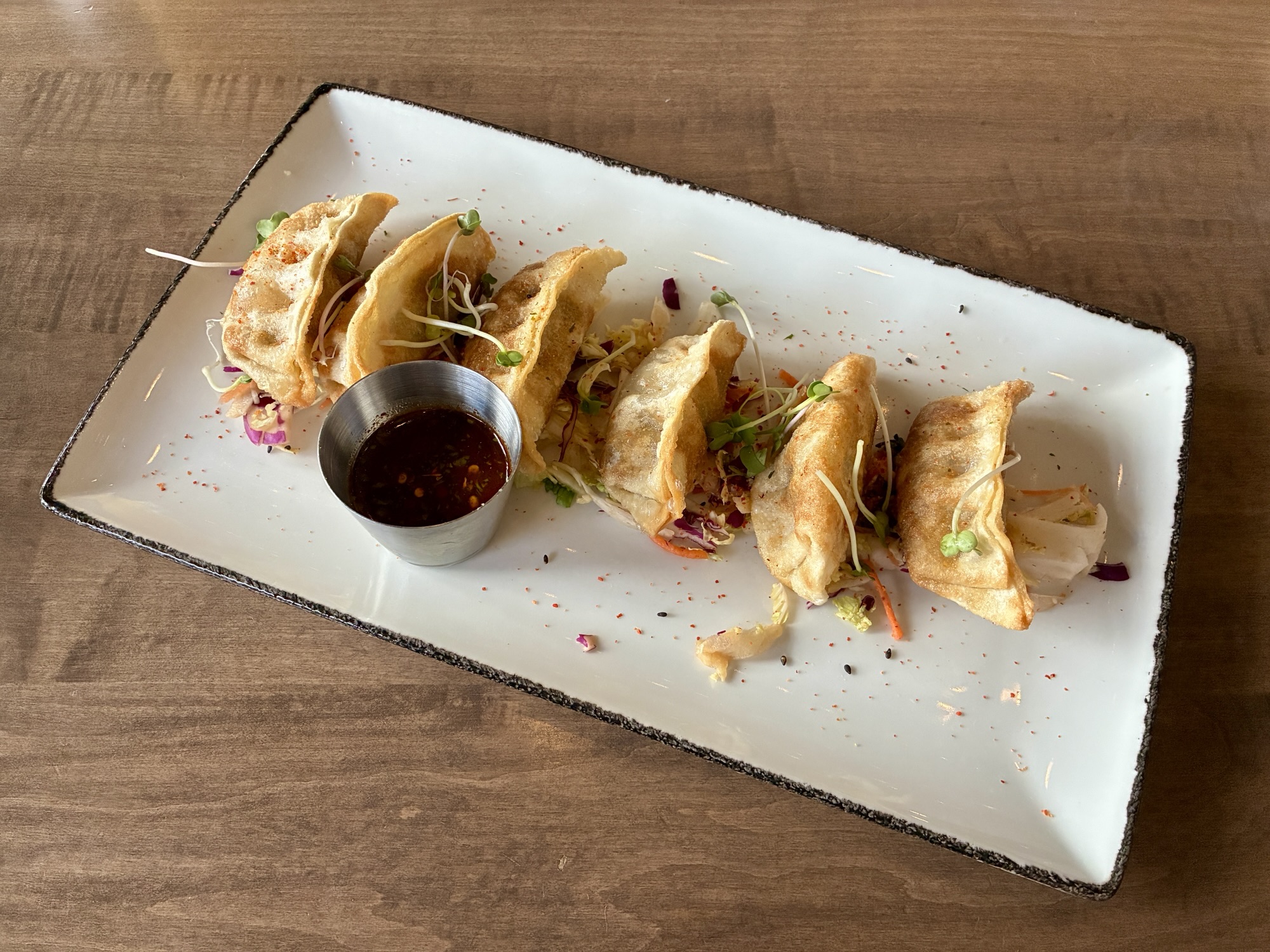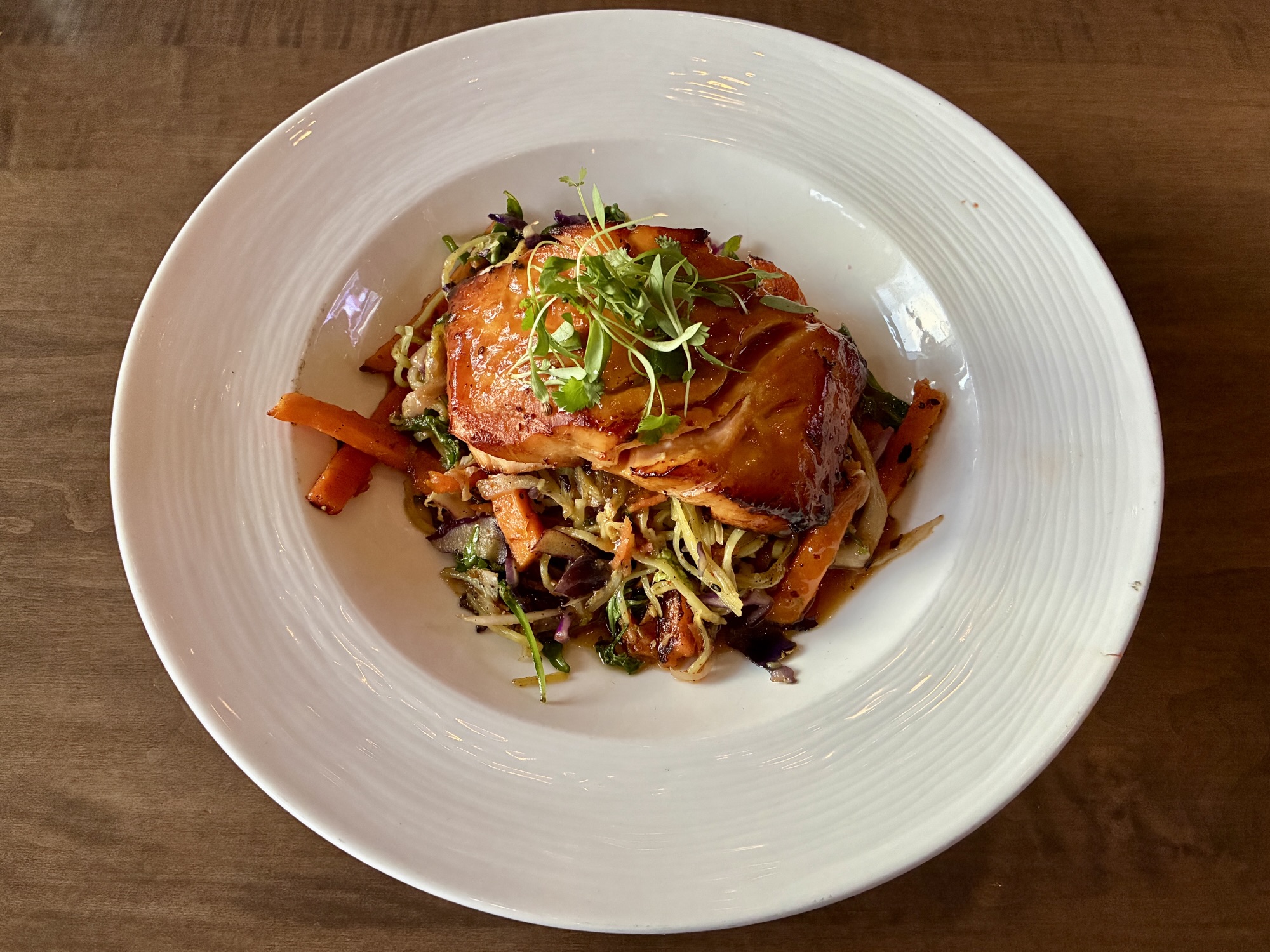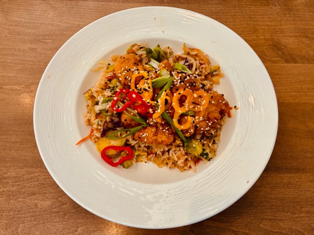 The approach shows itself among the appetizers, which include items like crisp vegetable pot stickers with ponzu sauce for dipping, fried cauliflower accessorized with gochujang, and bang bang shrimp with a slightly spicy aioli. Salads incorporate ingredient combinations like Brussels sprouts and arugula, fuji apples and watermelon radish, and peanuts with scallions, tomatoes, and an Asian “slaw” primarily of Napa cabbage in a Thai-influenced mix. All of the salads can be enhanced with a choice of protein for an additional cost: shrimp, chicken, steak, salmon, or tofu.