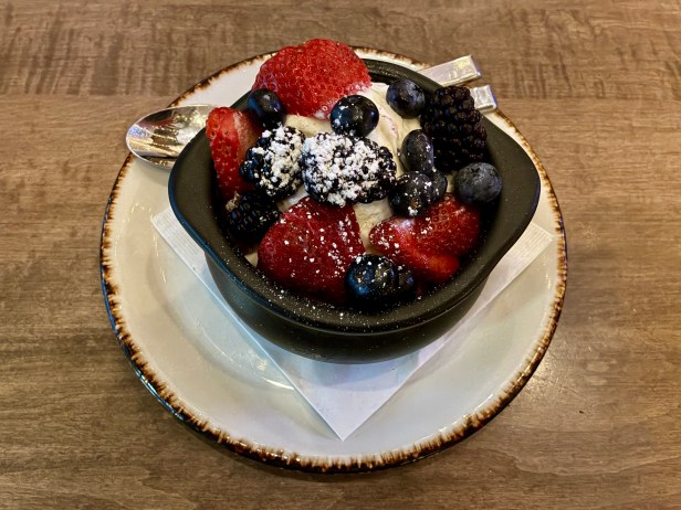 Desserts include a variety of flavors of gelato made on site, a New York style cheesecake with a strawberry glaze and fresh berries, and two standout items:. A chocolate coconut cake is labeled as “tres leches,” but staff guide customer expectations away from that menu description in favor of a simpler pairing of flavors that is still effective and pleasing. A St. Louis butter cake has a moist base topped with vanilla gelato and mixed berries, and all the ingredients, both warm and cold, melt into one inviting blend in the small bowl in which they are served.